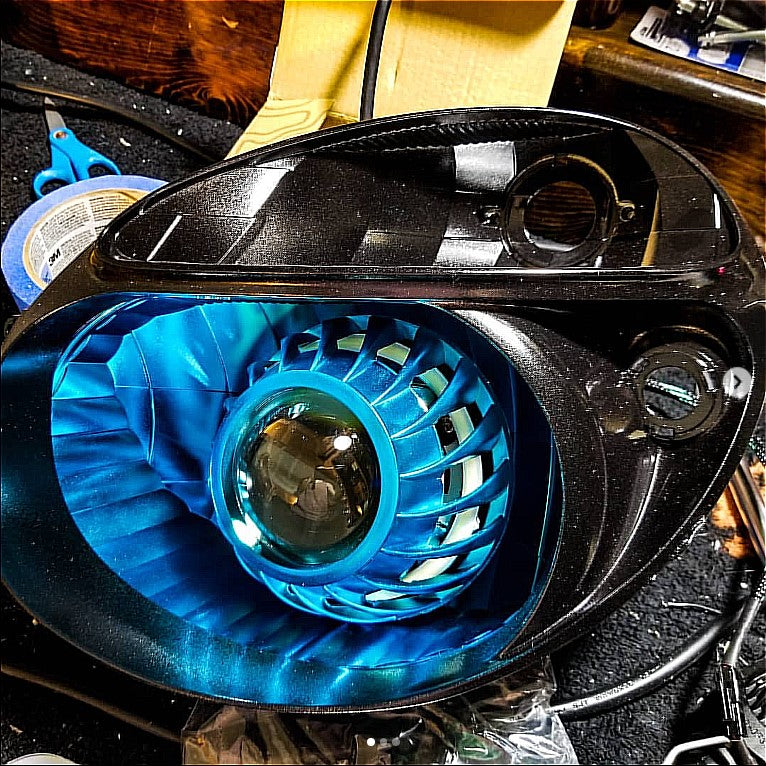 Custom retrofitted headlights for Subaru Impreza/WRX models.