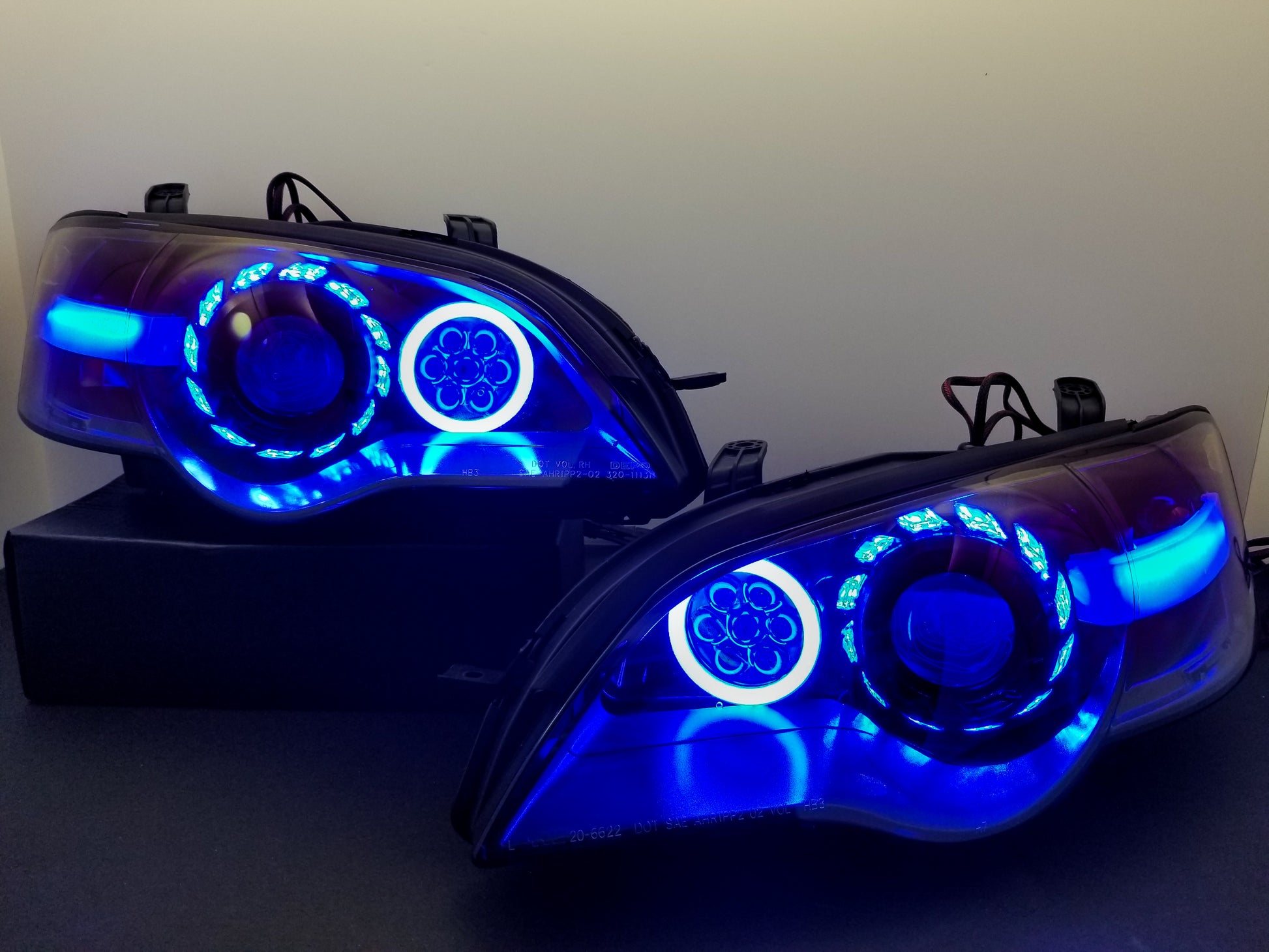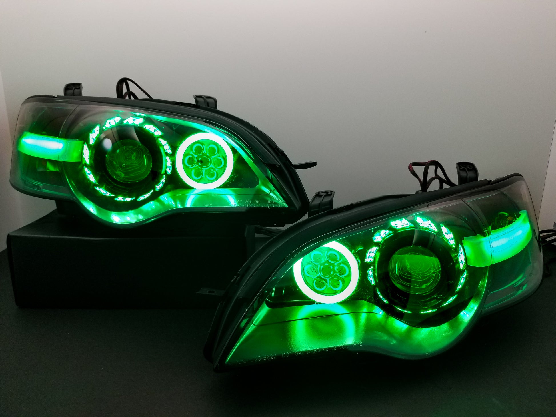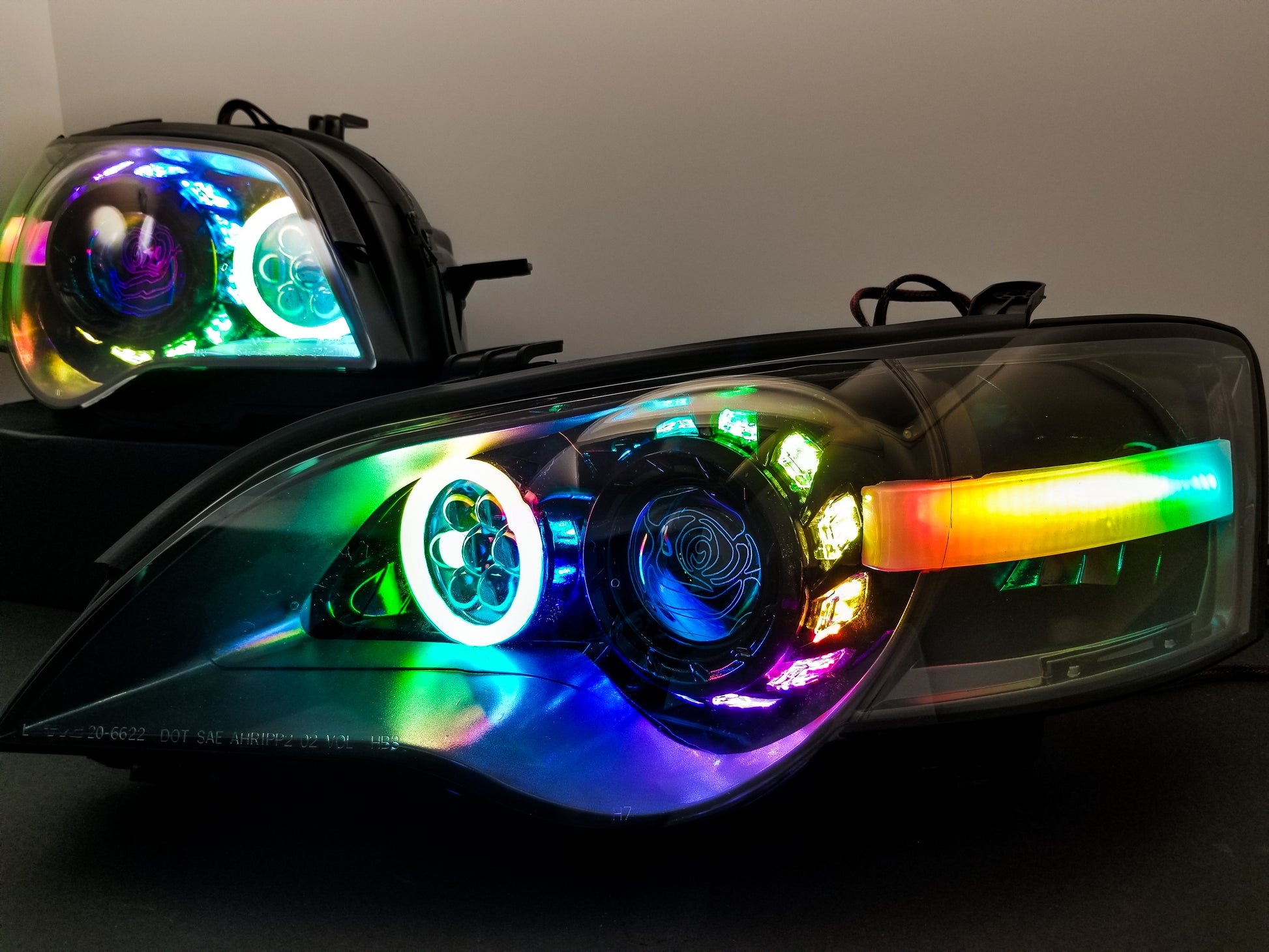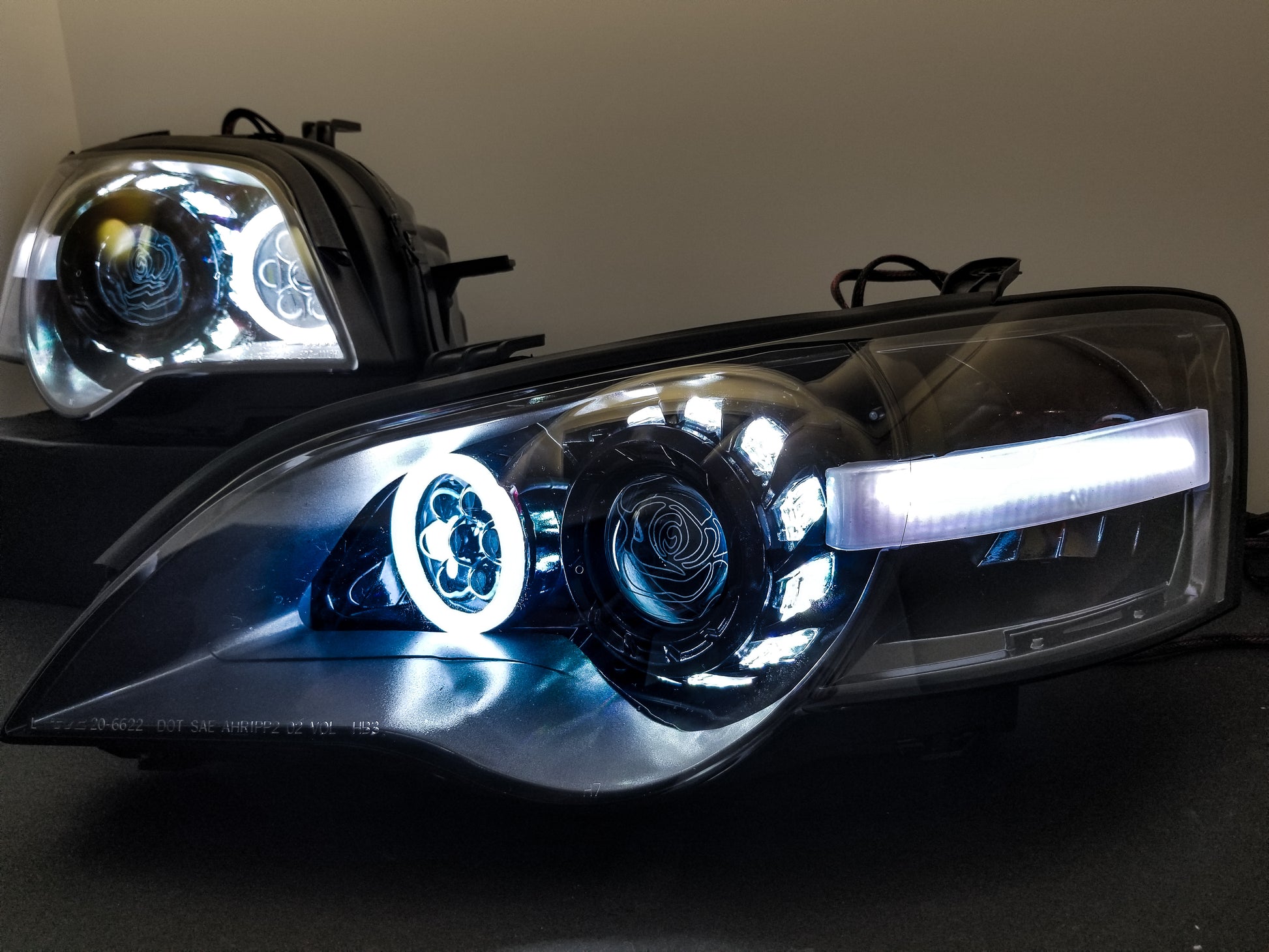 Custom retrofitted headlights for Subaru Legacy/Outback models.