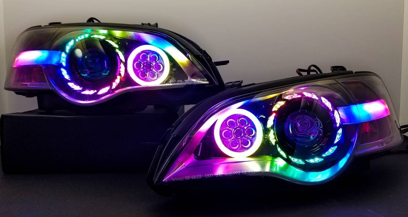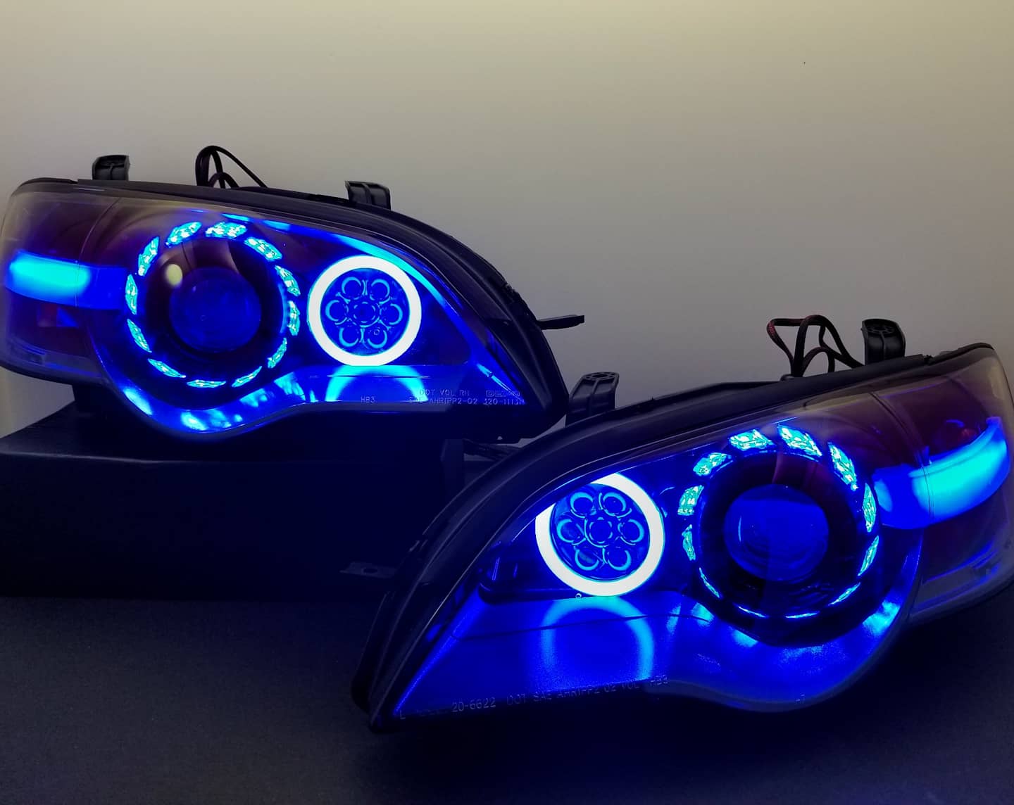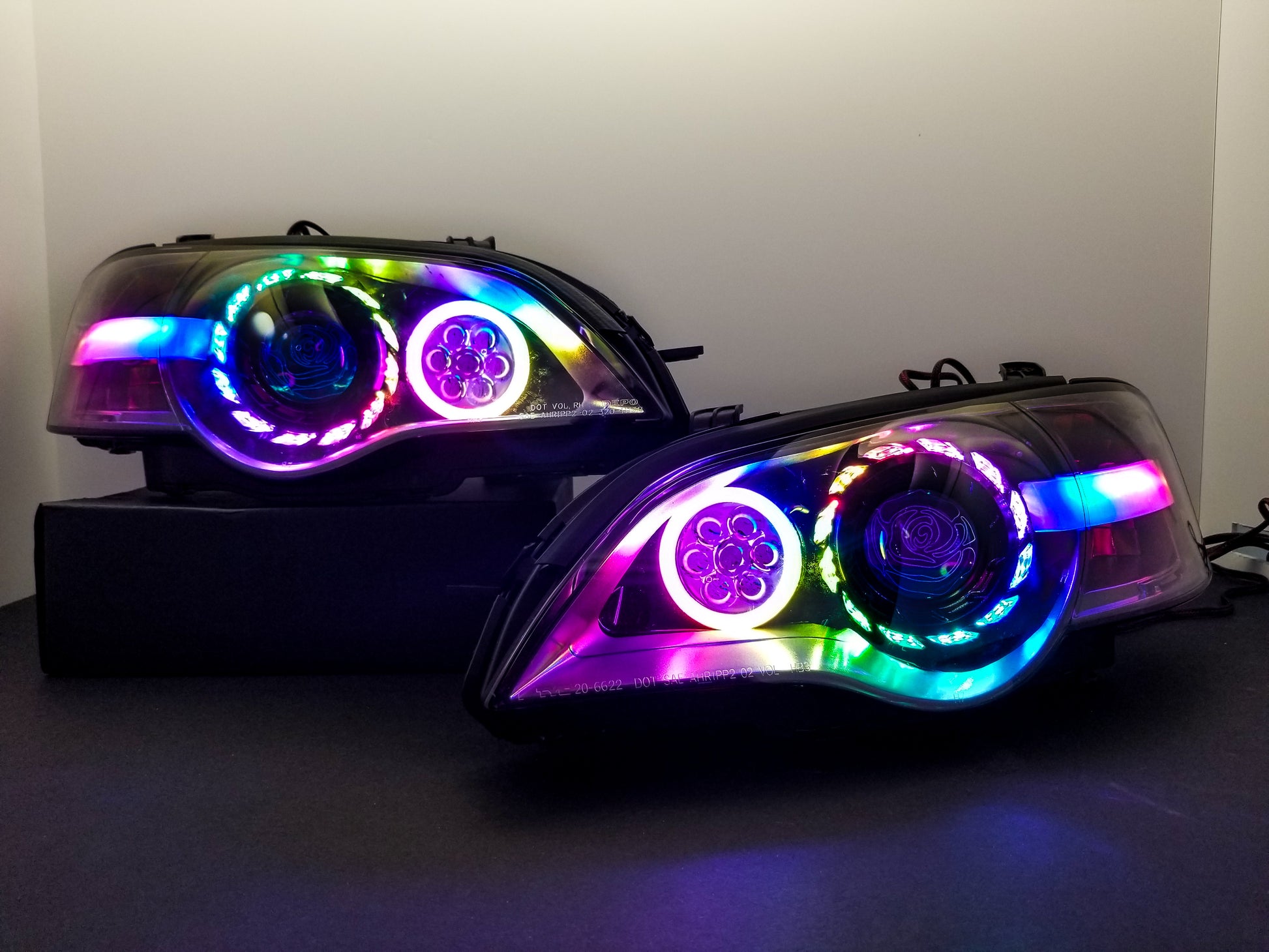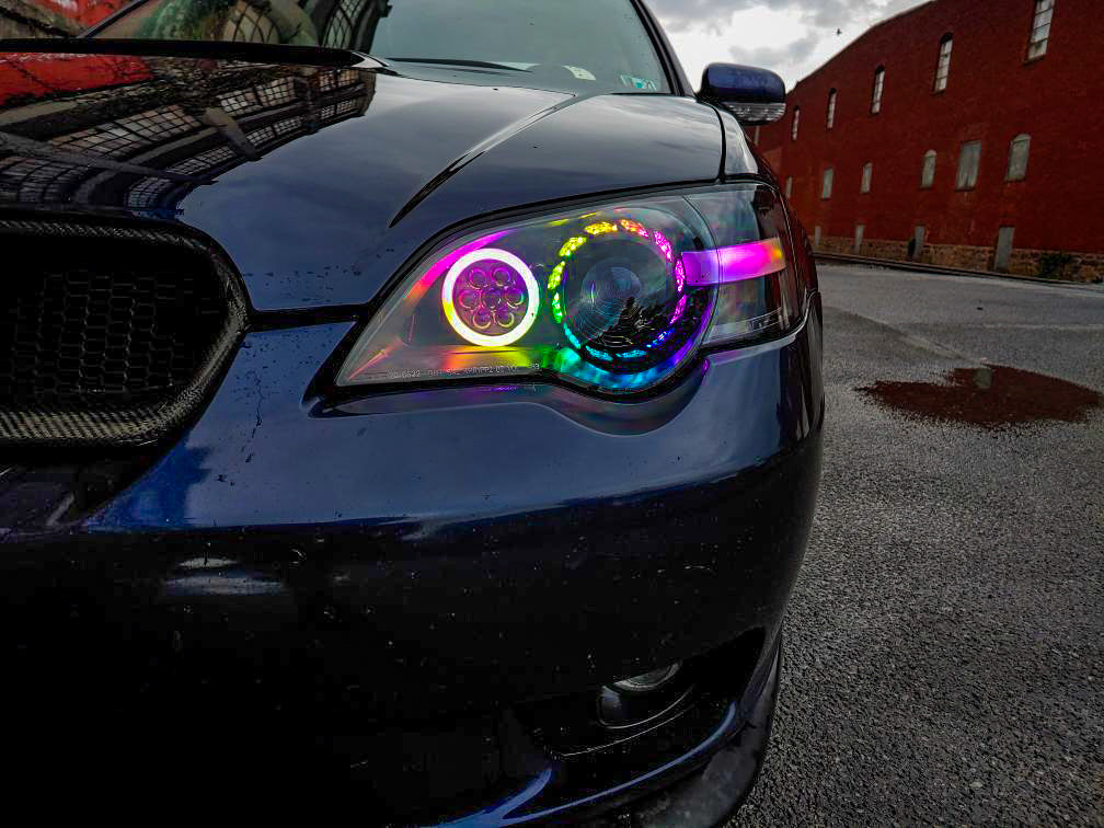 Custom retrofitted headlights for Subaru Legacy/Outback models.