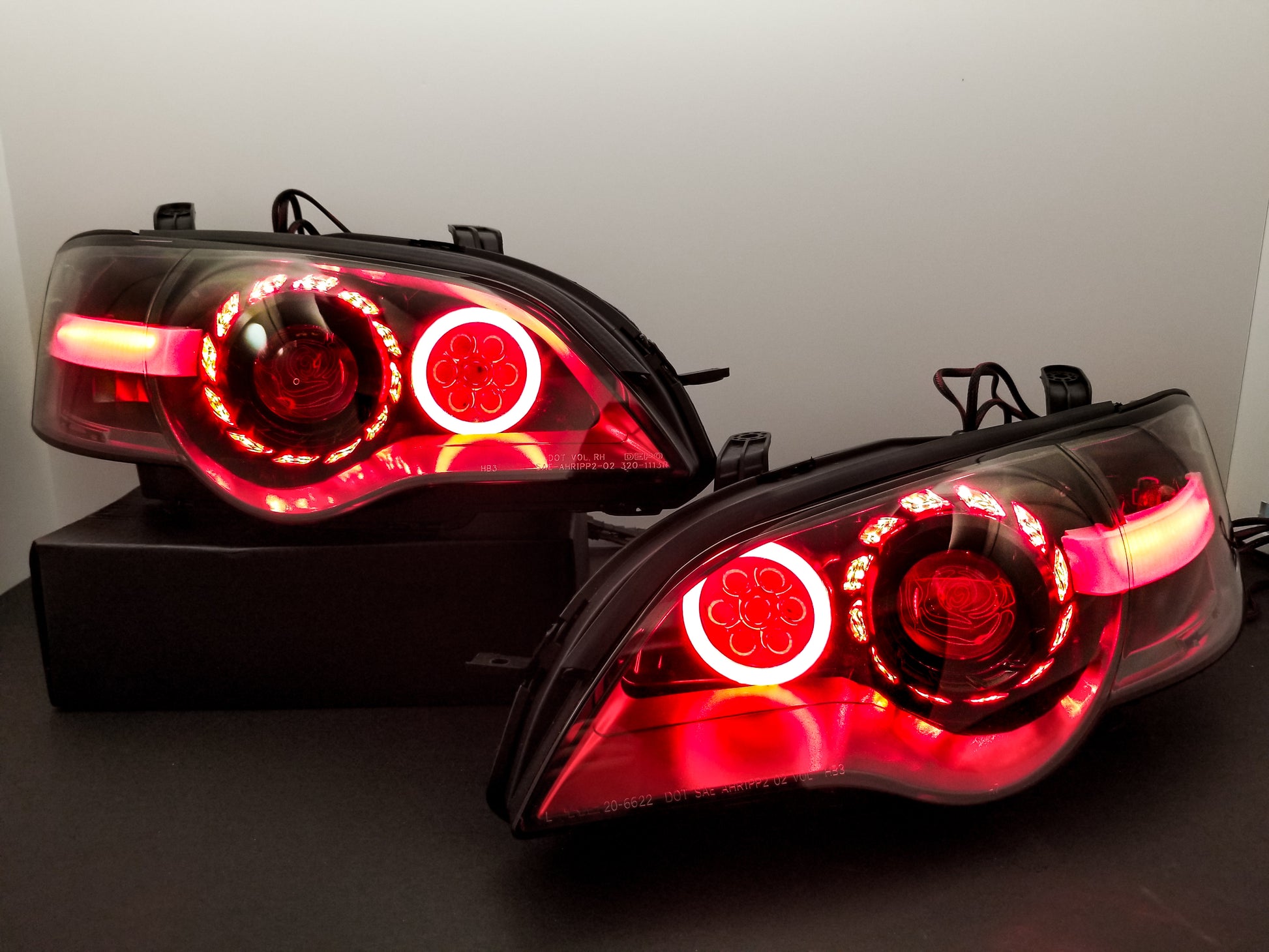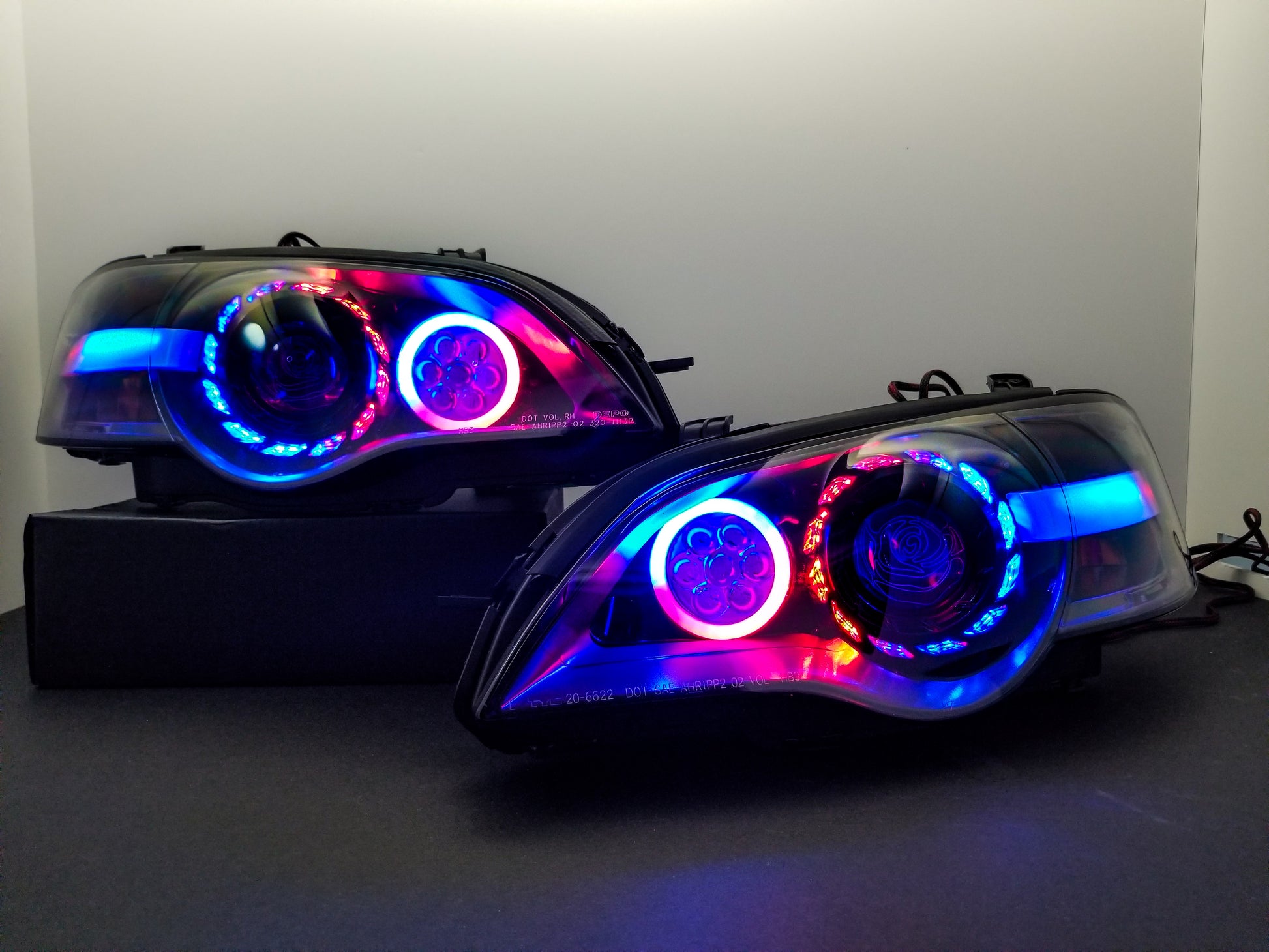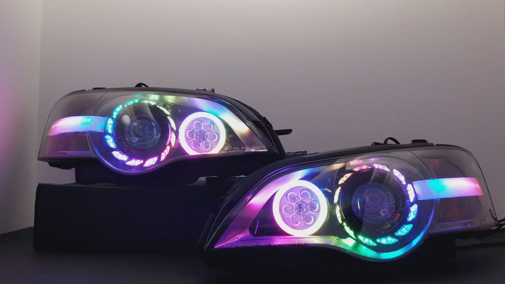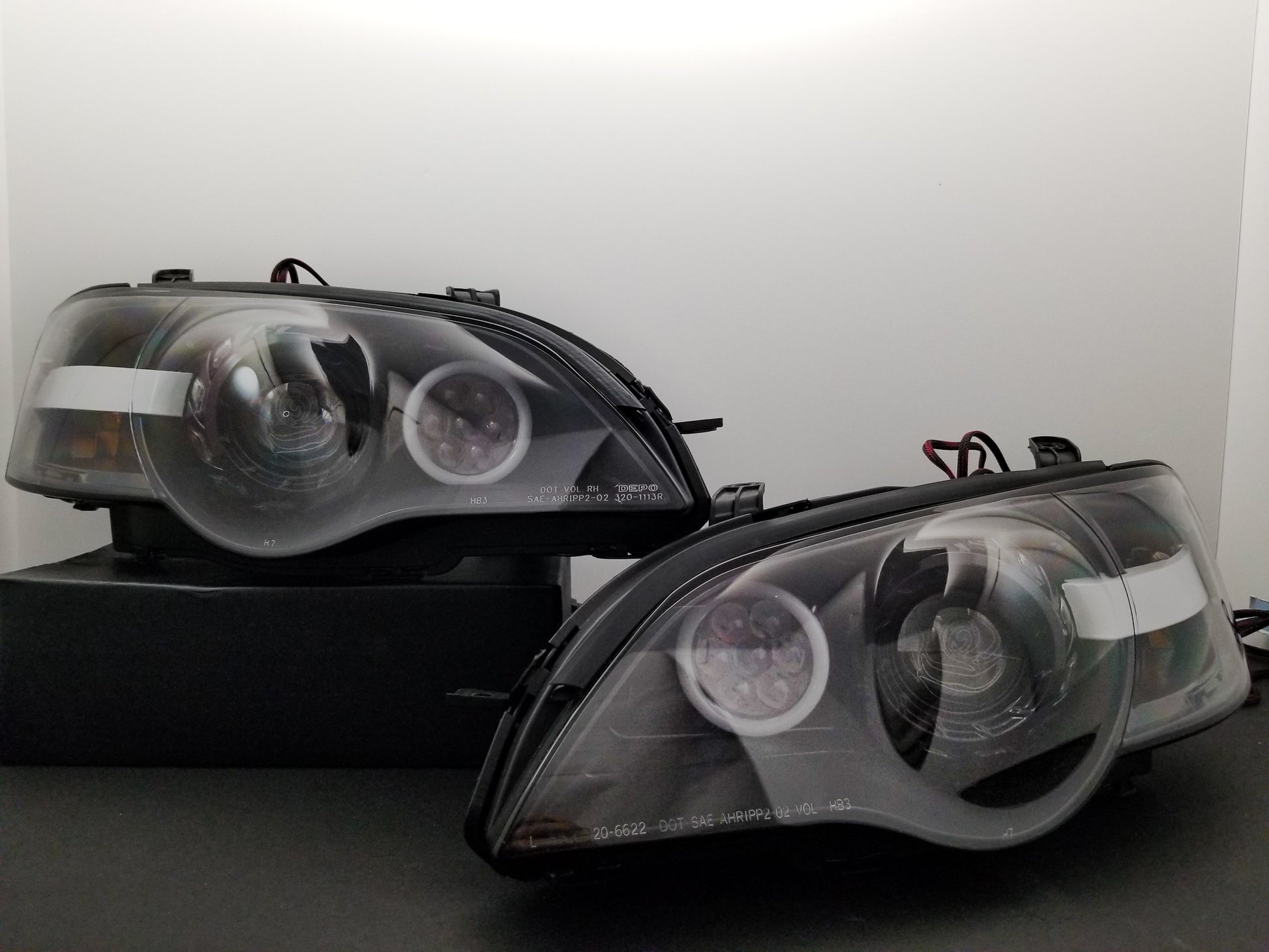 Custom retrofitted headlights for Subaru Legacy/Outback models.