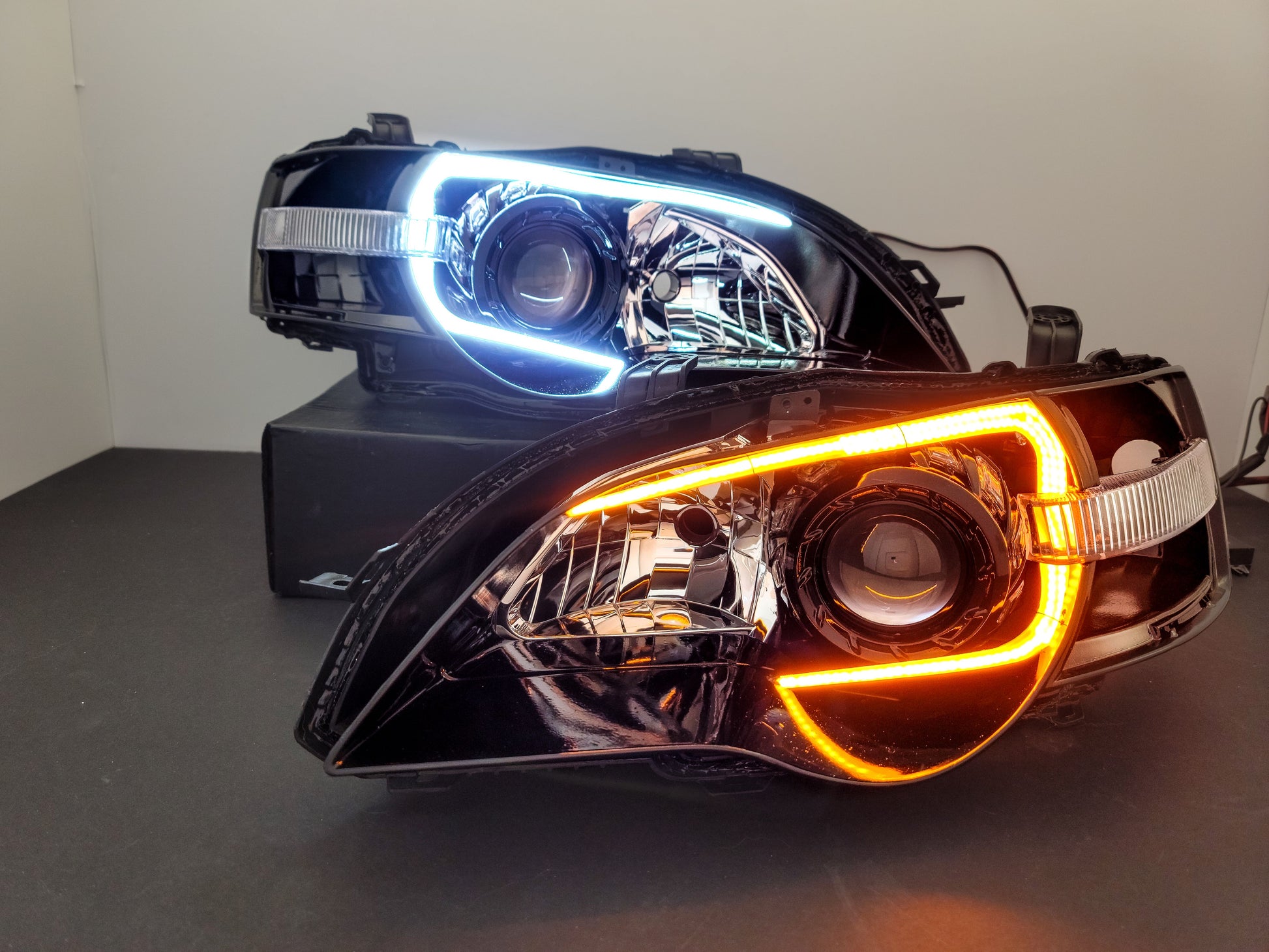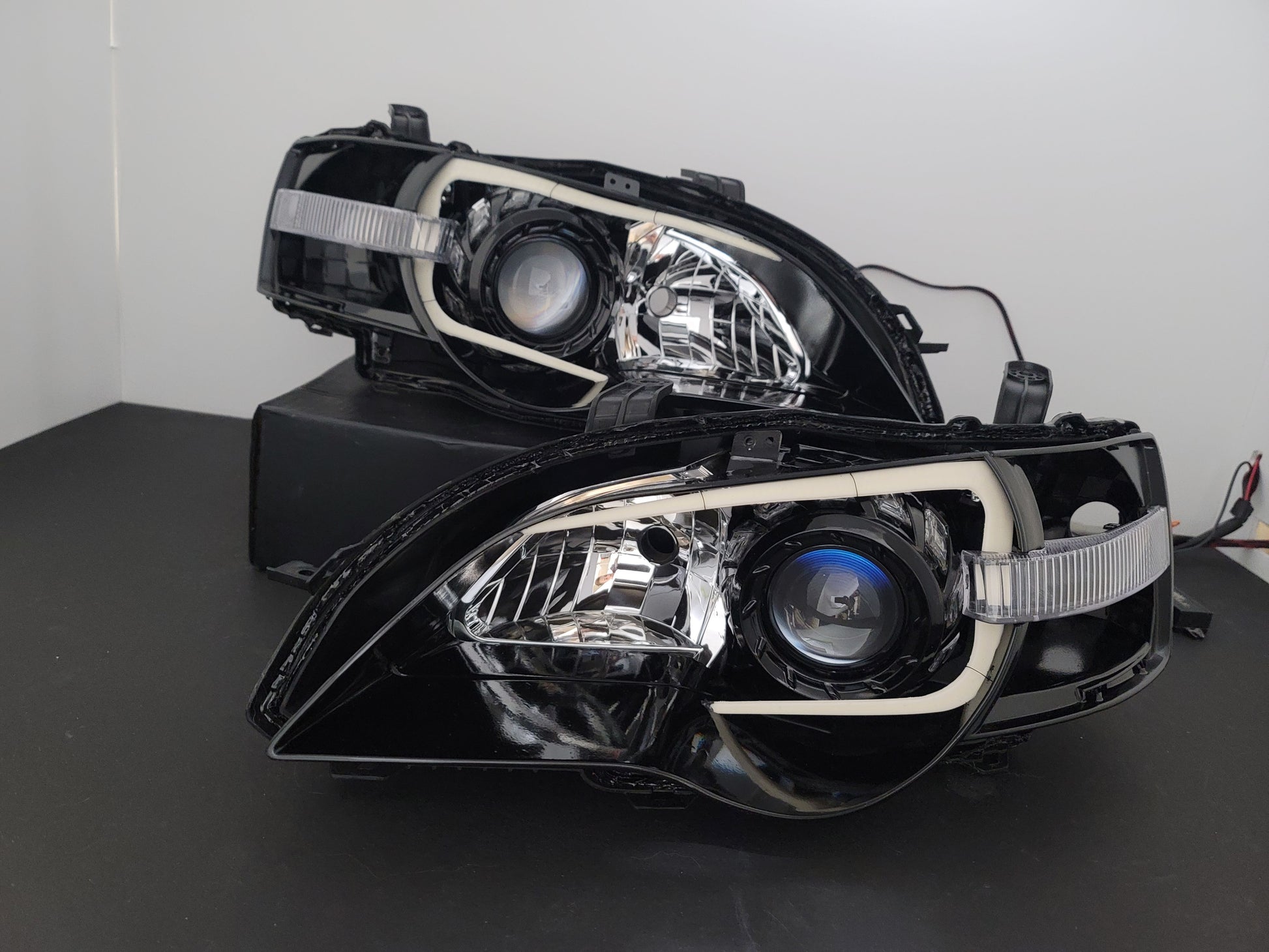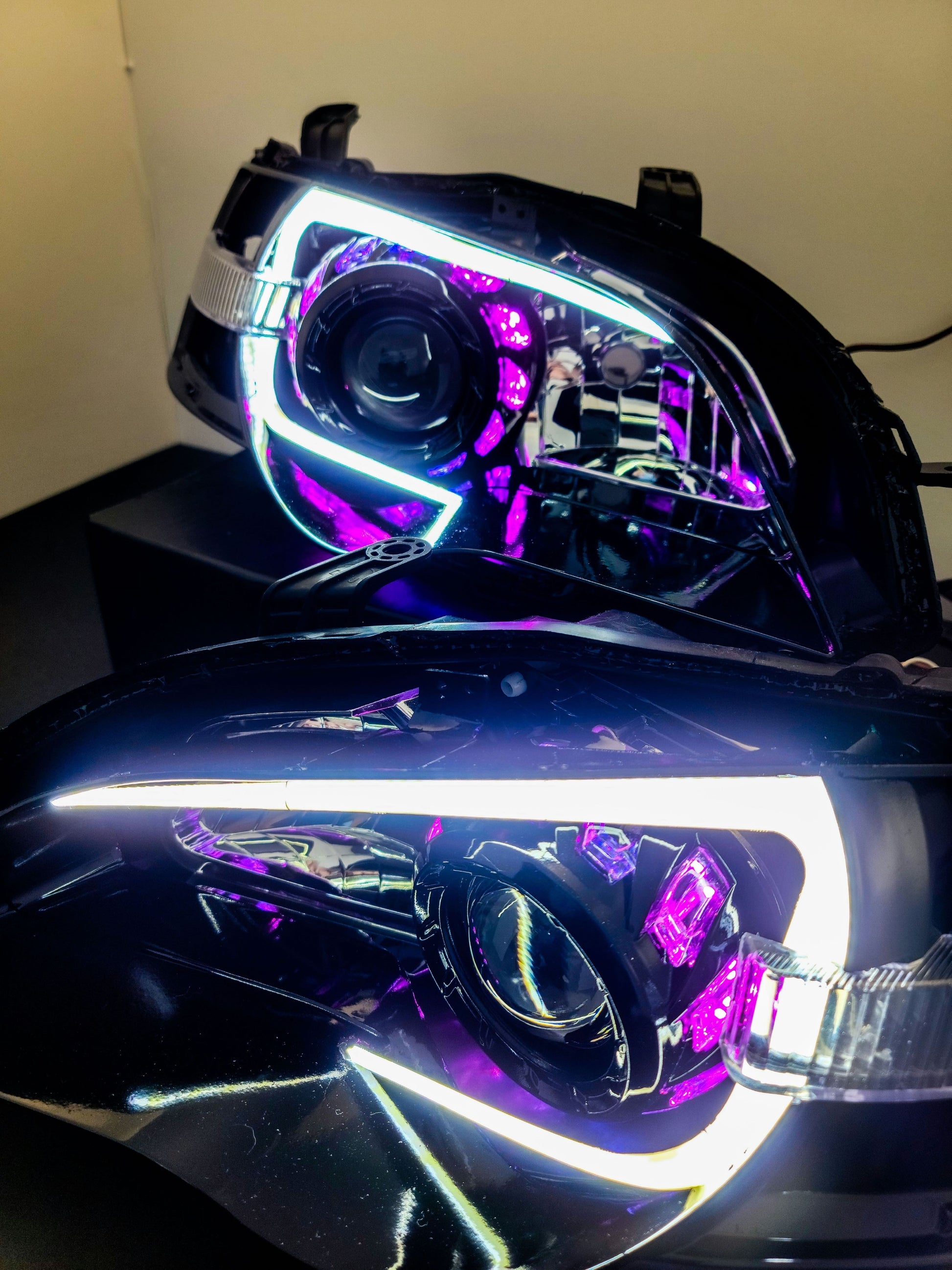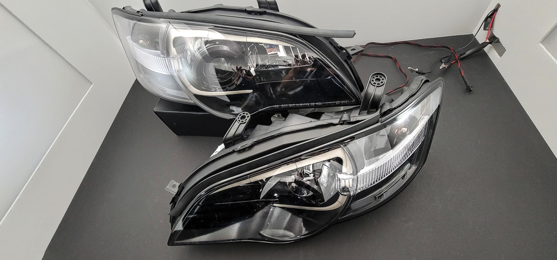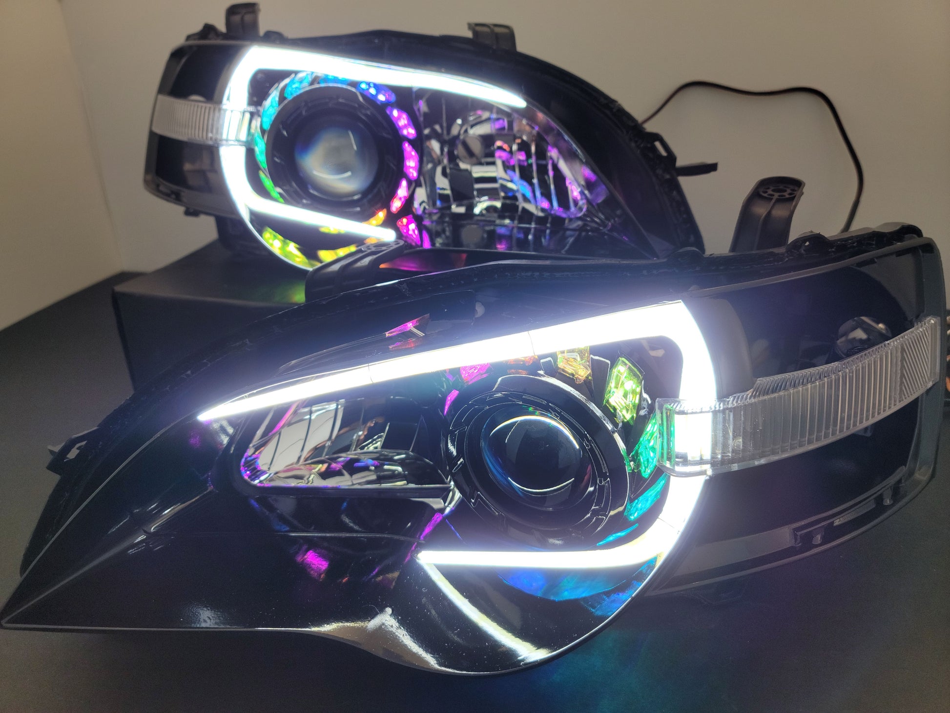 Custom retrofitted headlights for Subaru Legacy/Outback models.