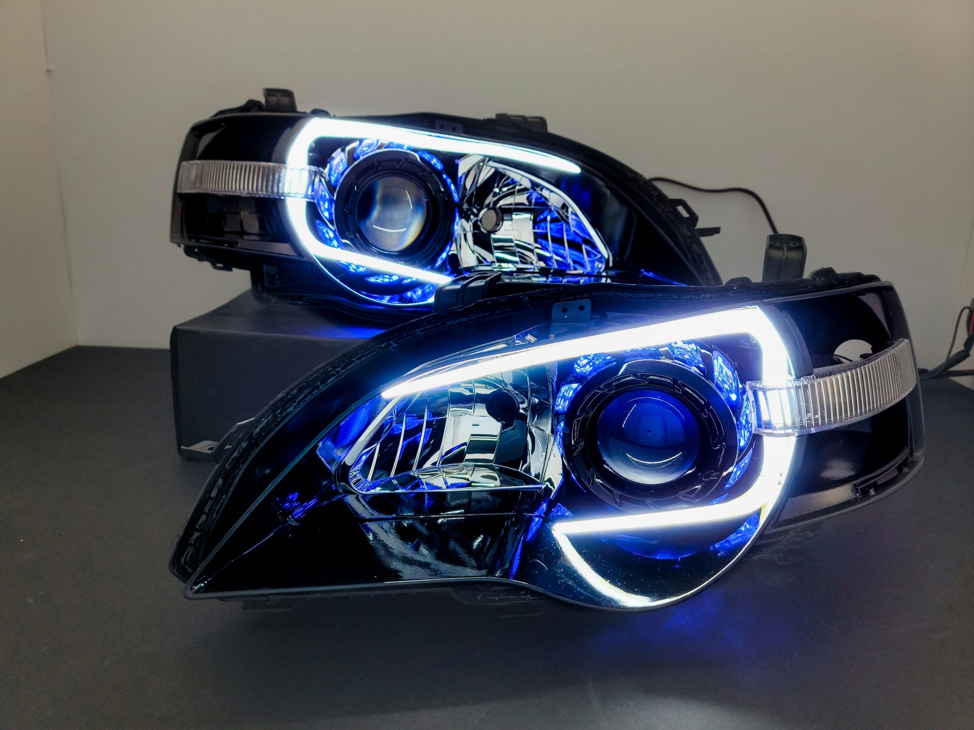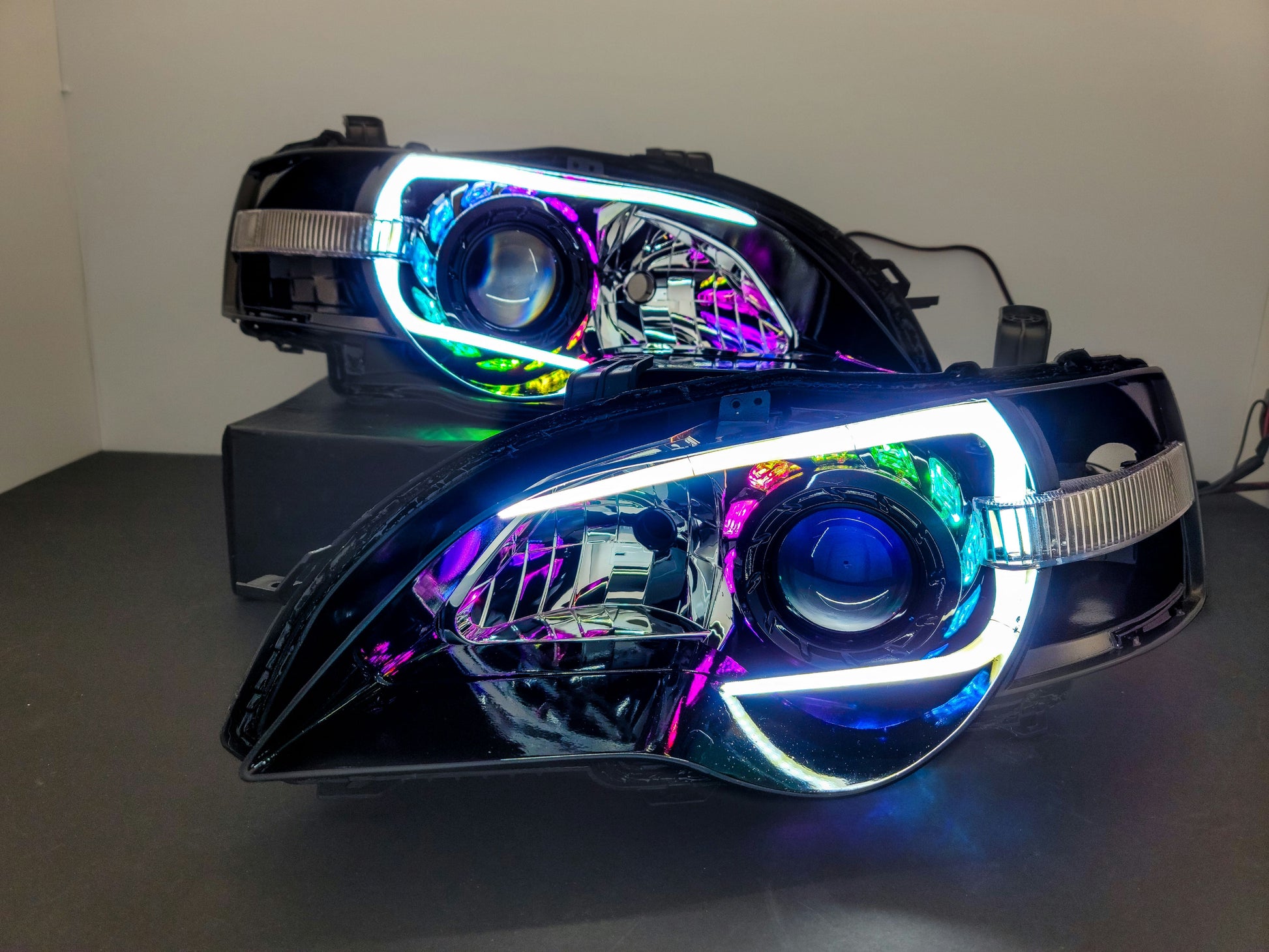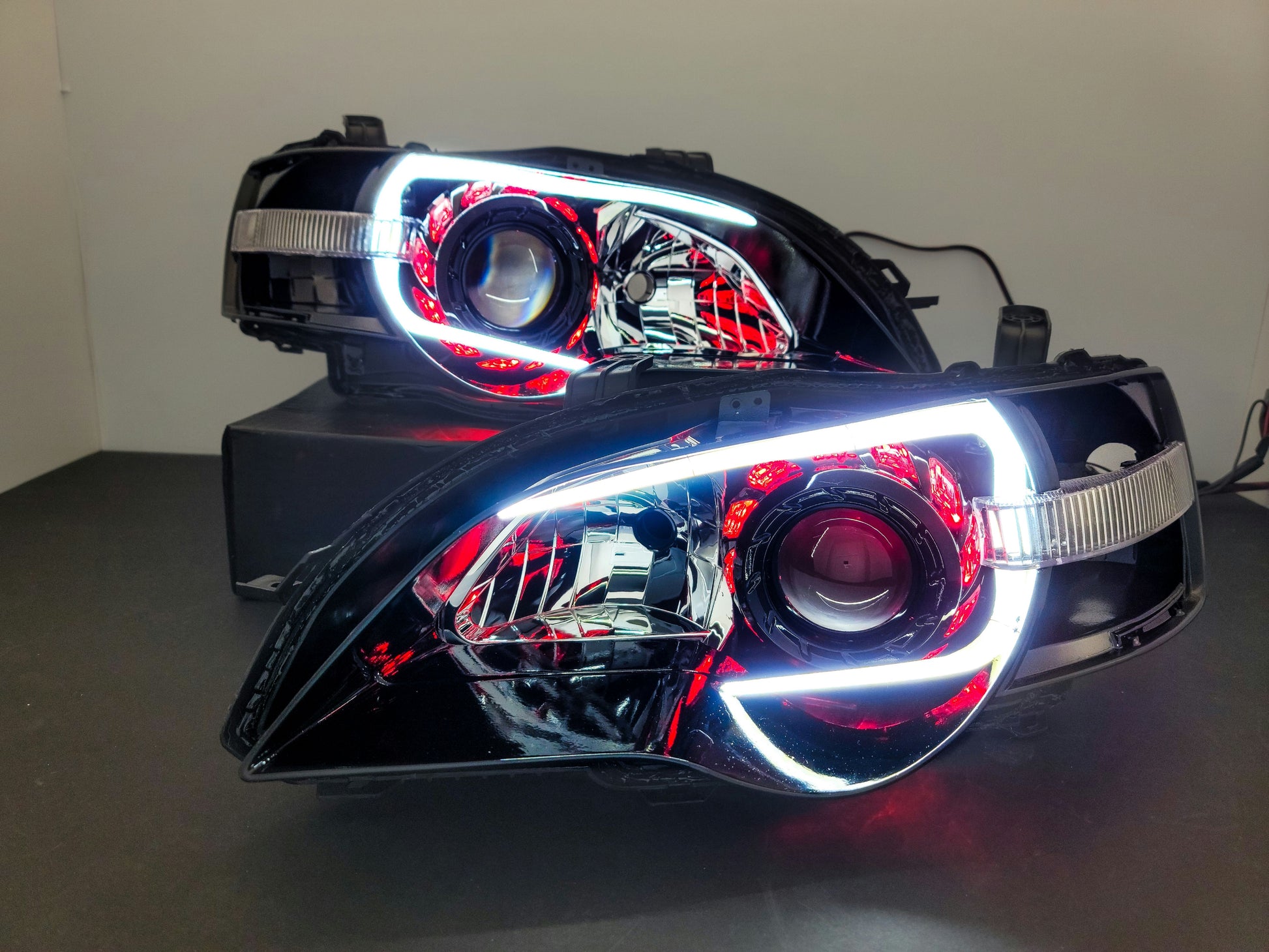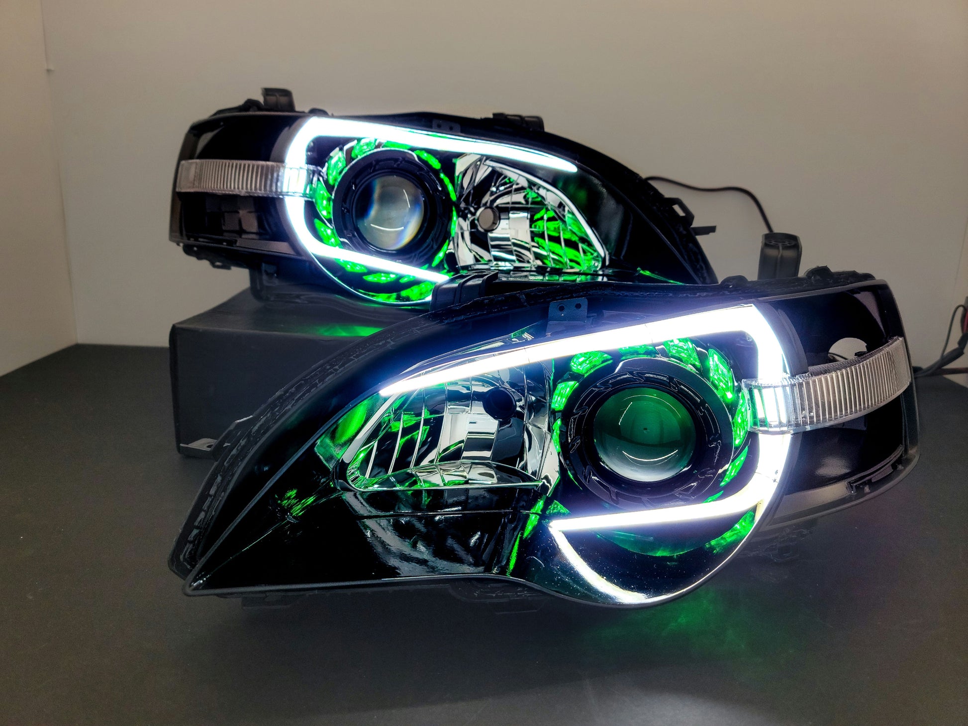 Custom retrofitted headlights for Subaru Legacy/Outback models.