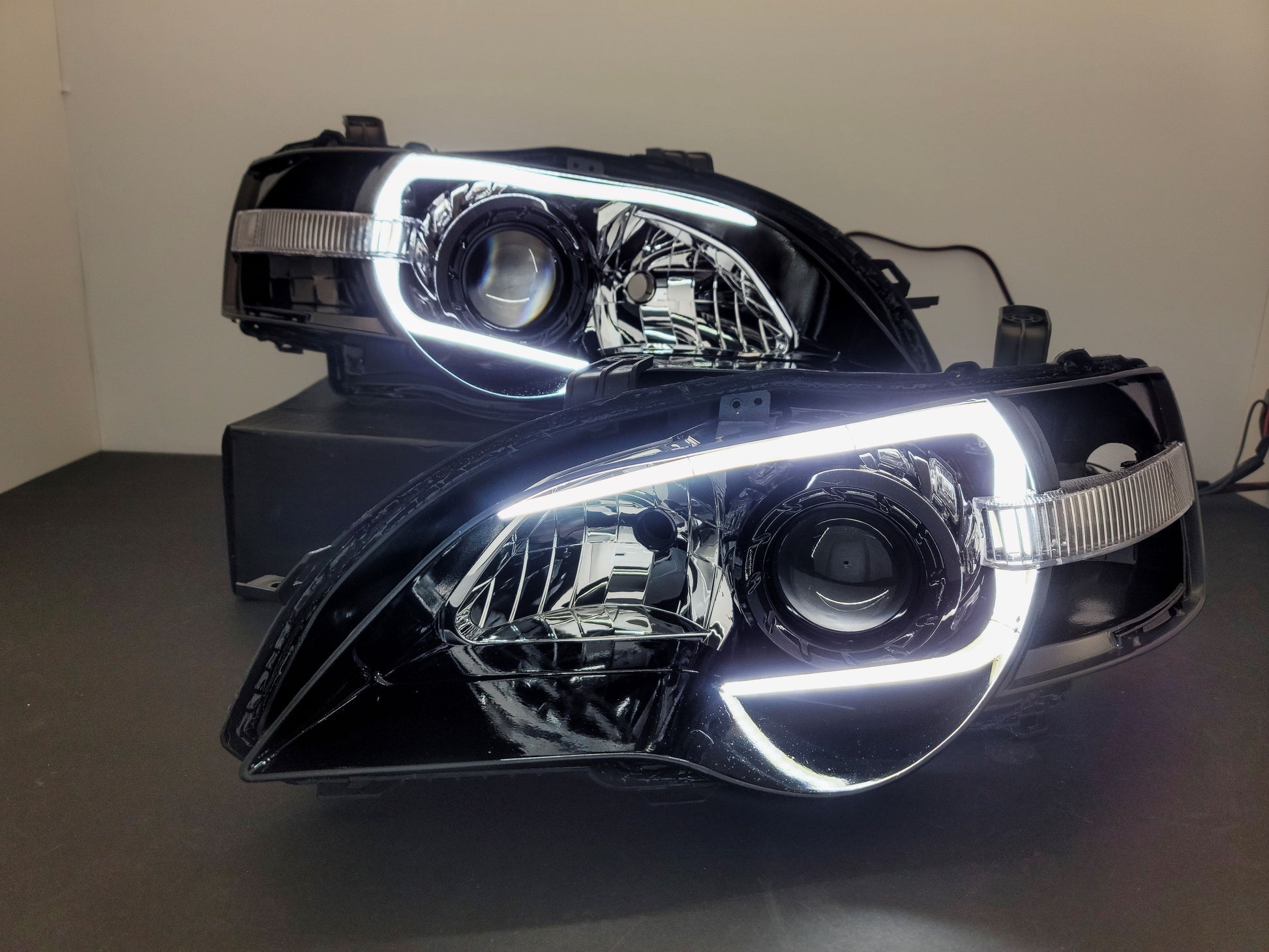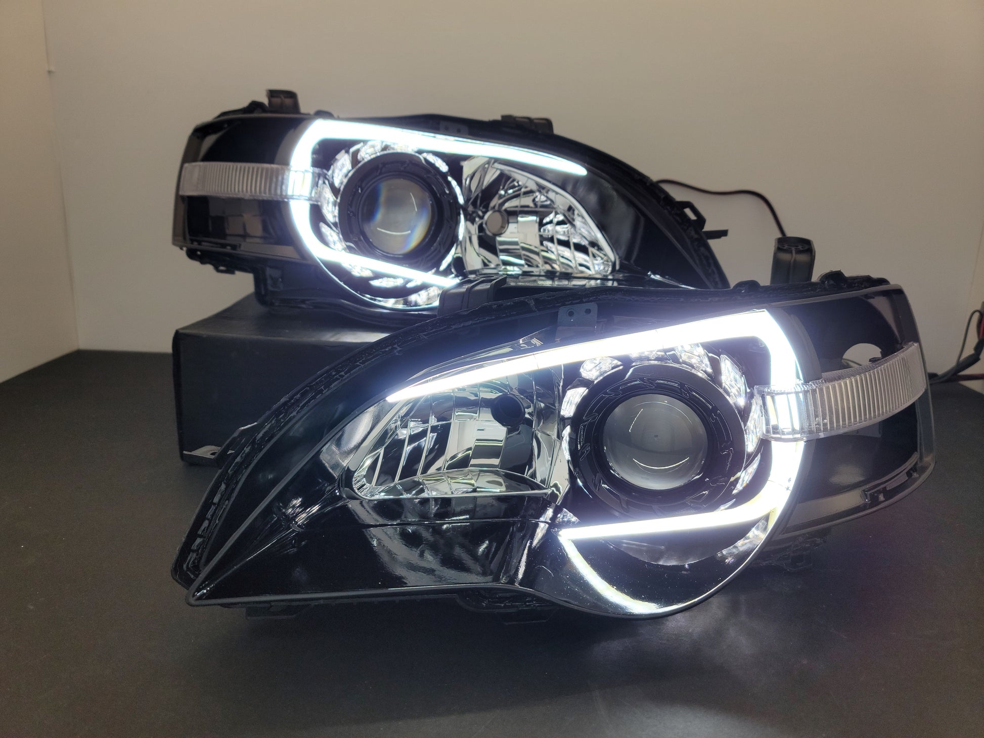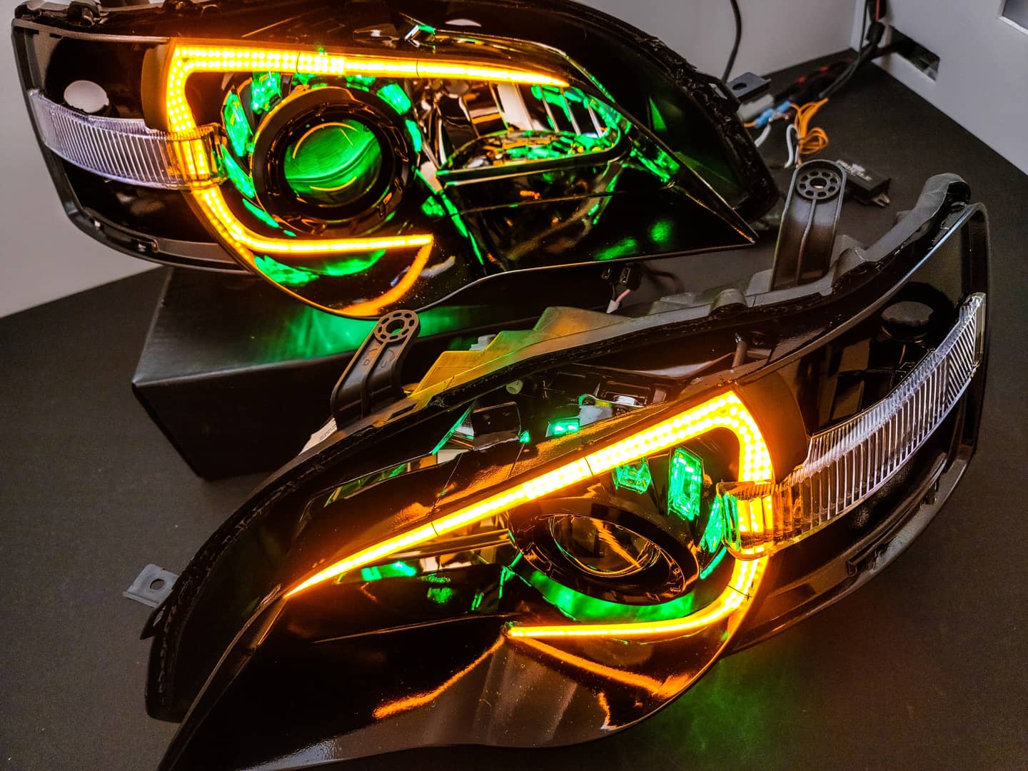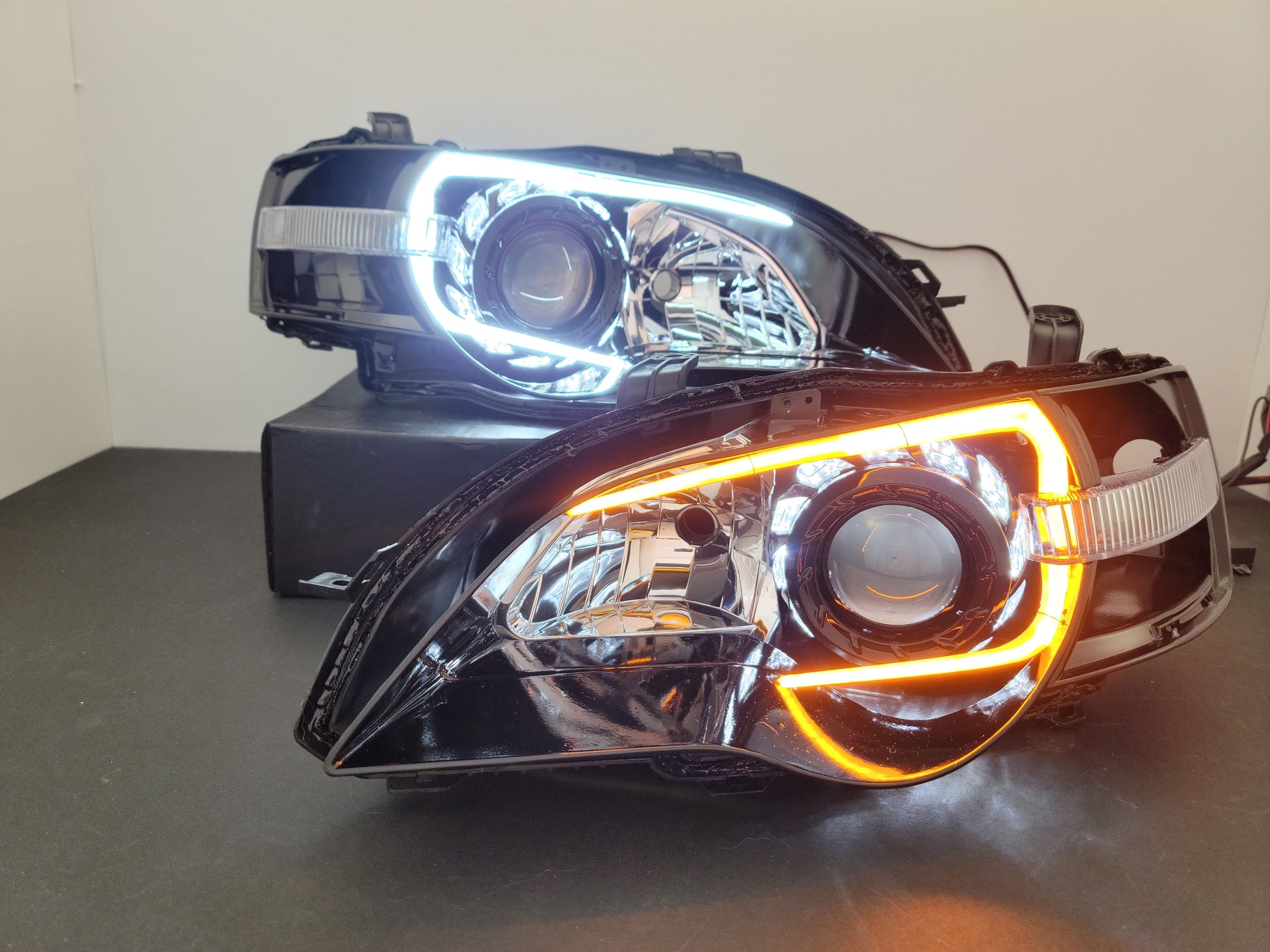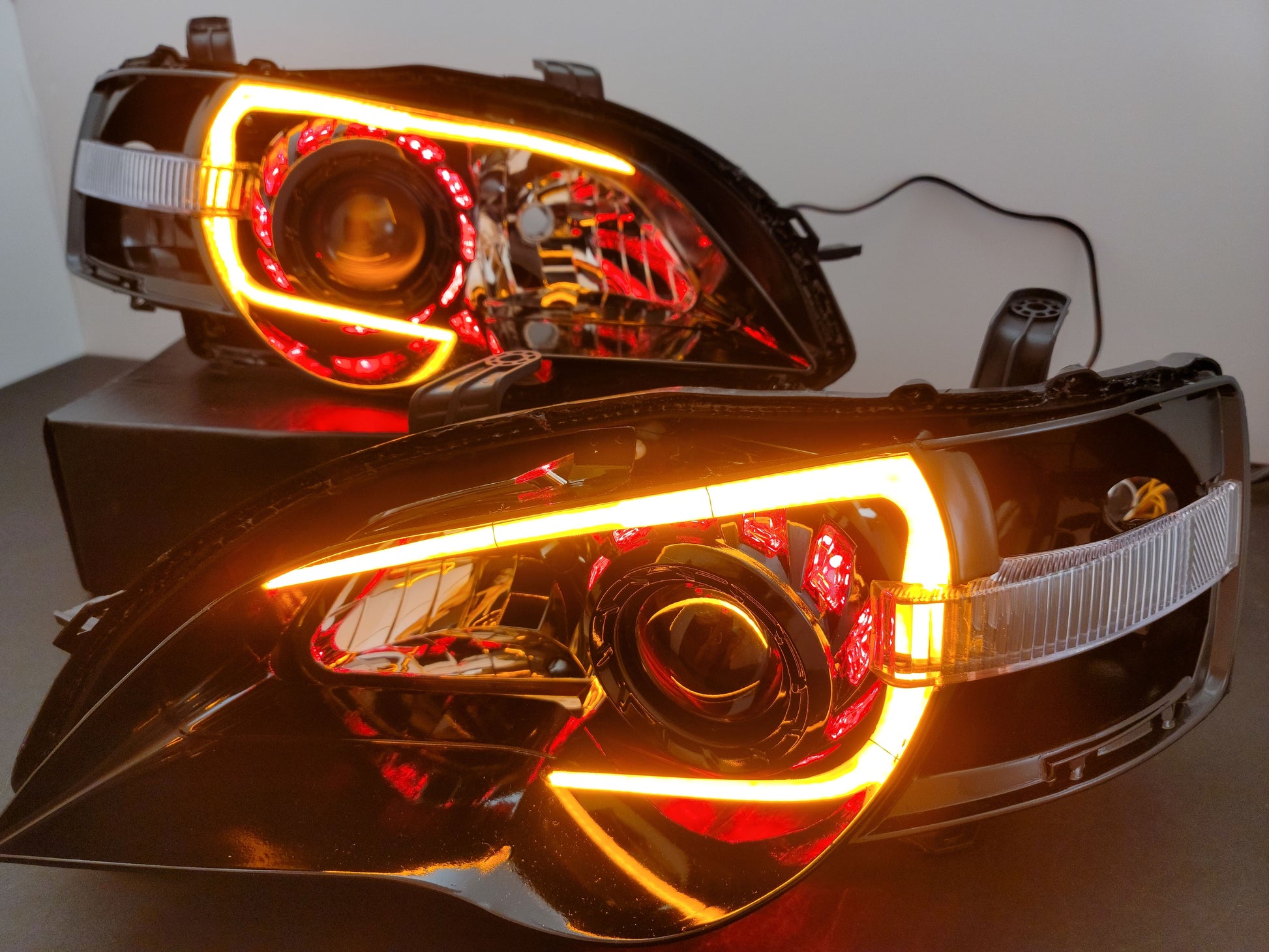 Custom retrofitted headlights for Subaru Legacy/Outback models.