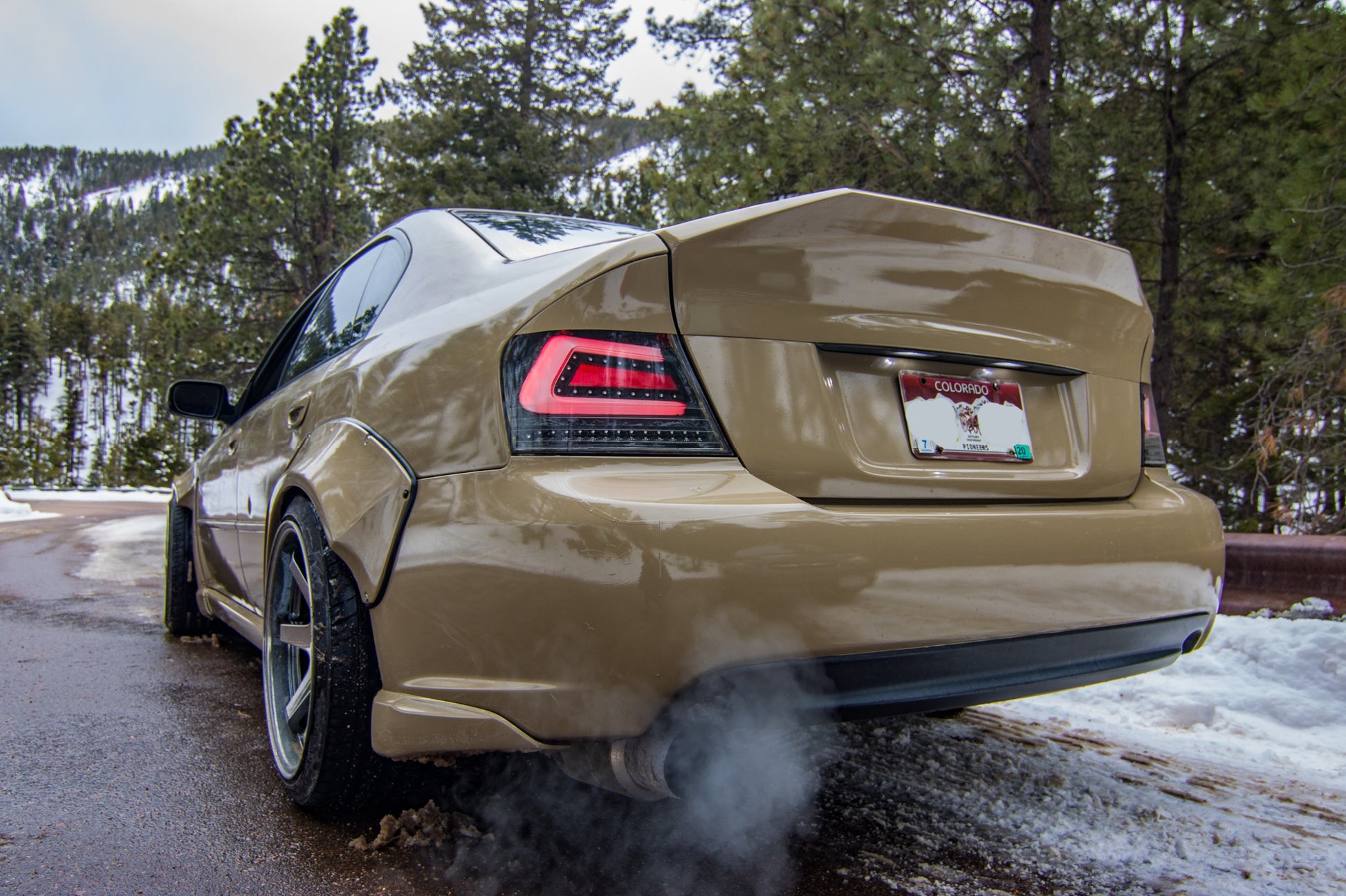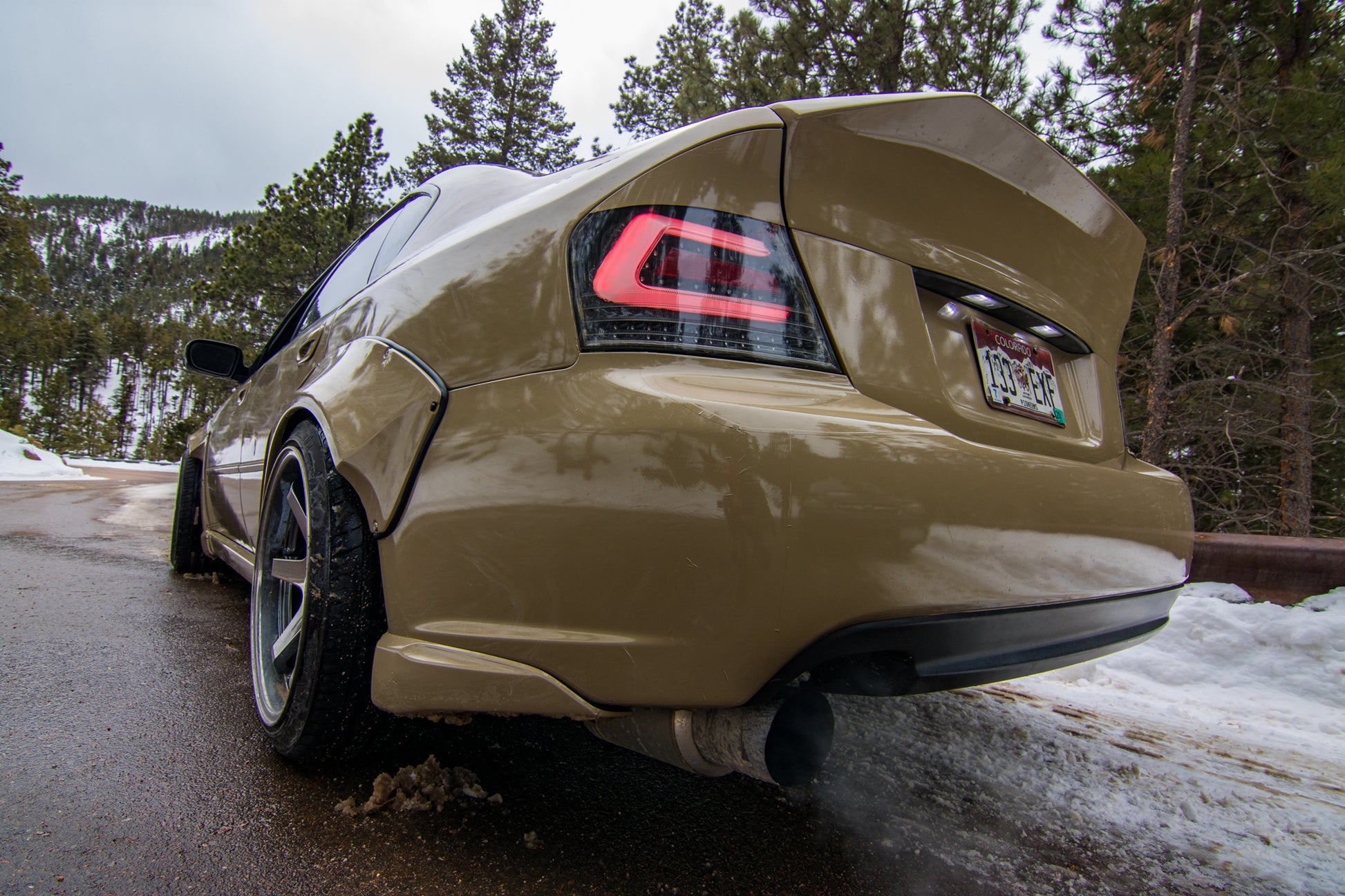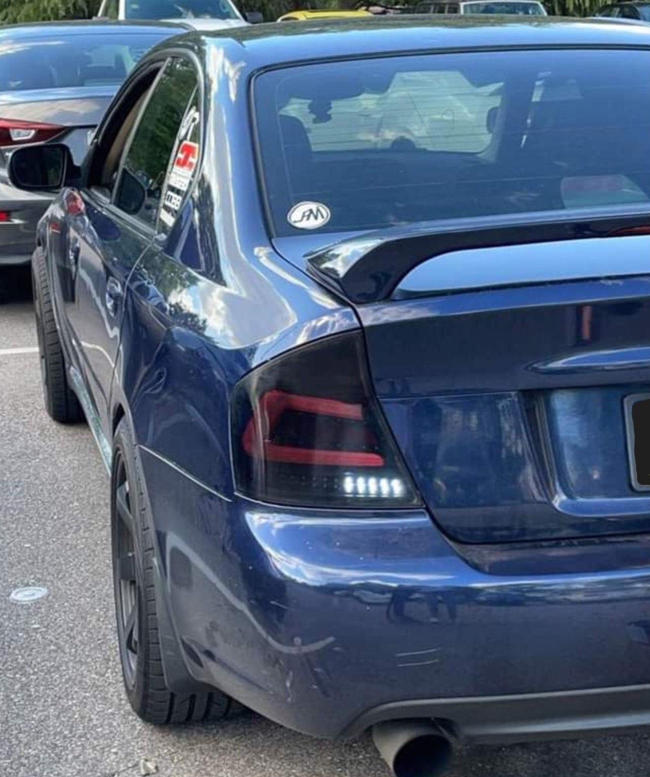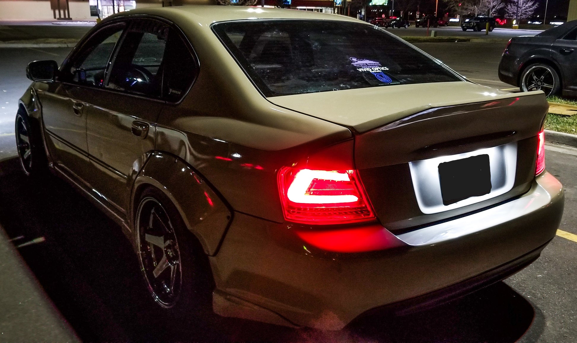 Custom retrofitted tail lights for Subaru Legacy Sedan models.