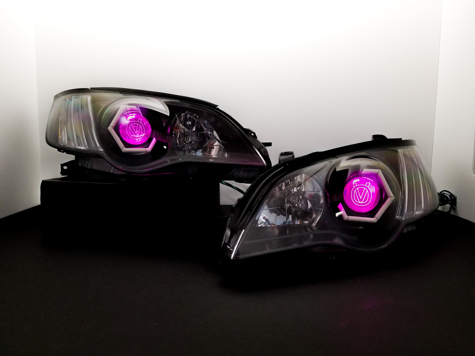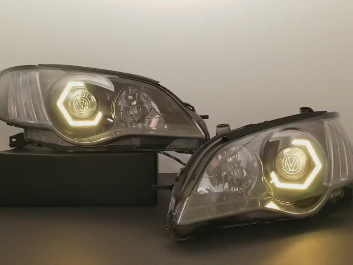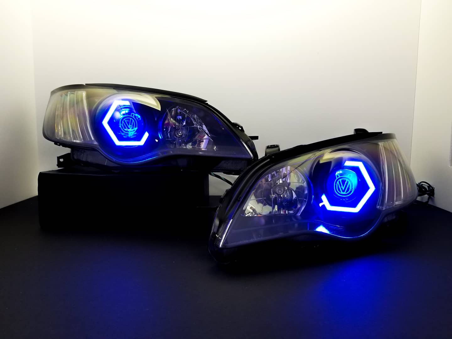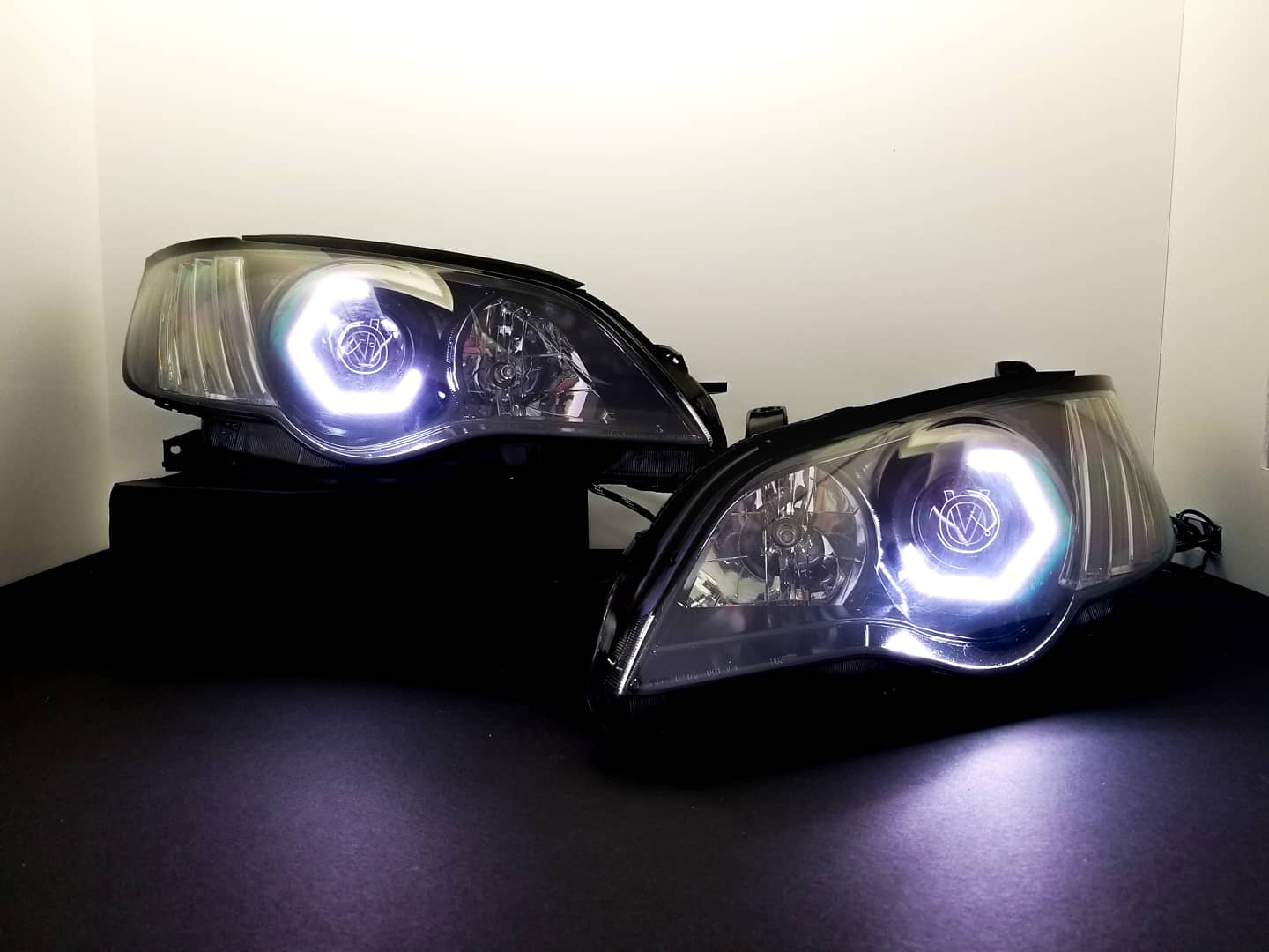 Custom retrofitted headlights for Subaru Legacy/Outback models.
