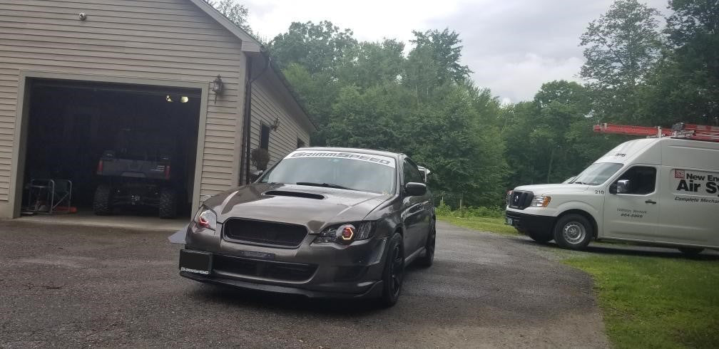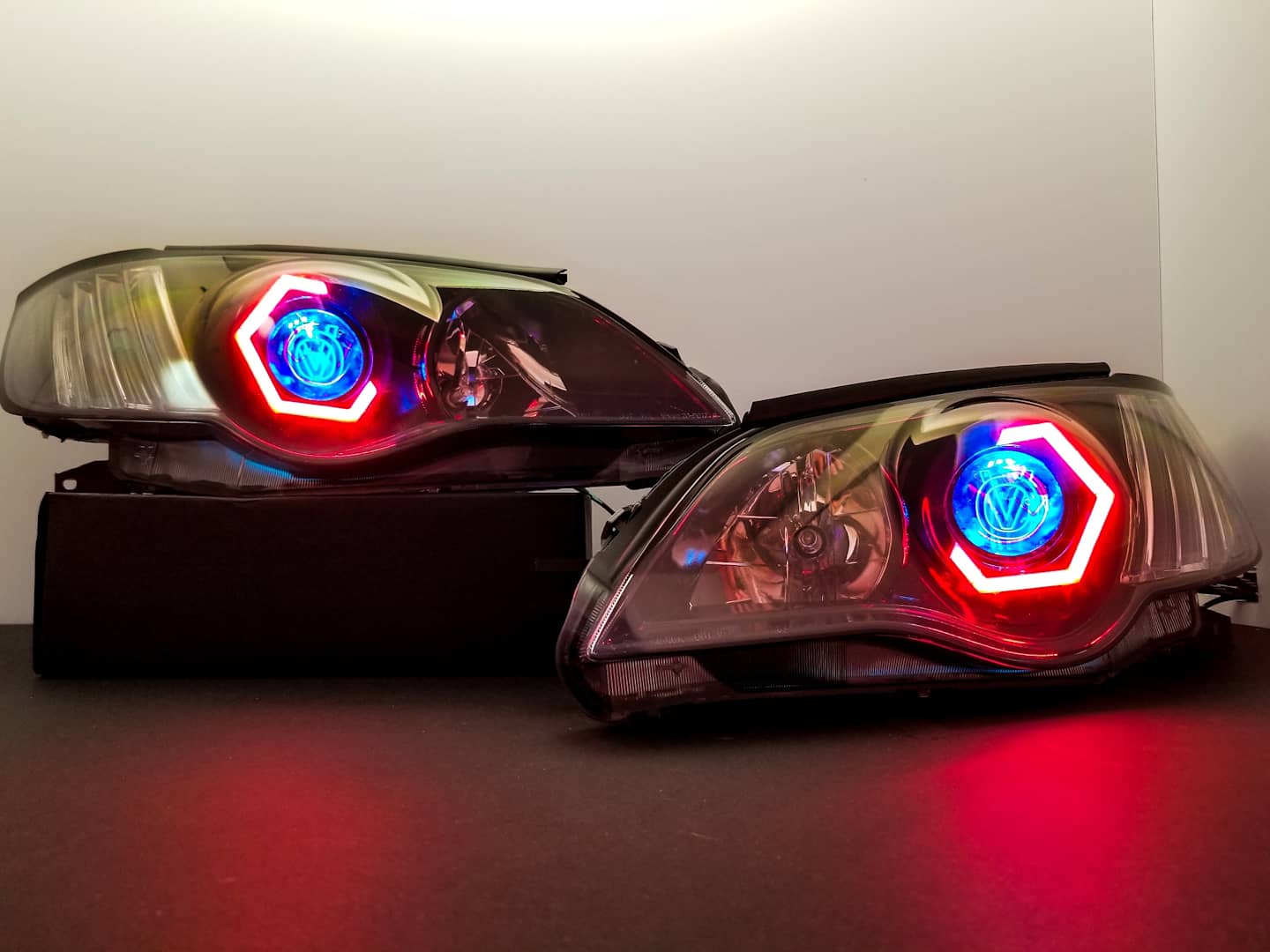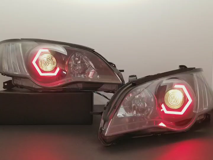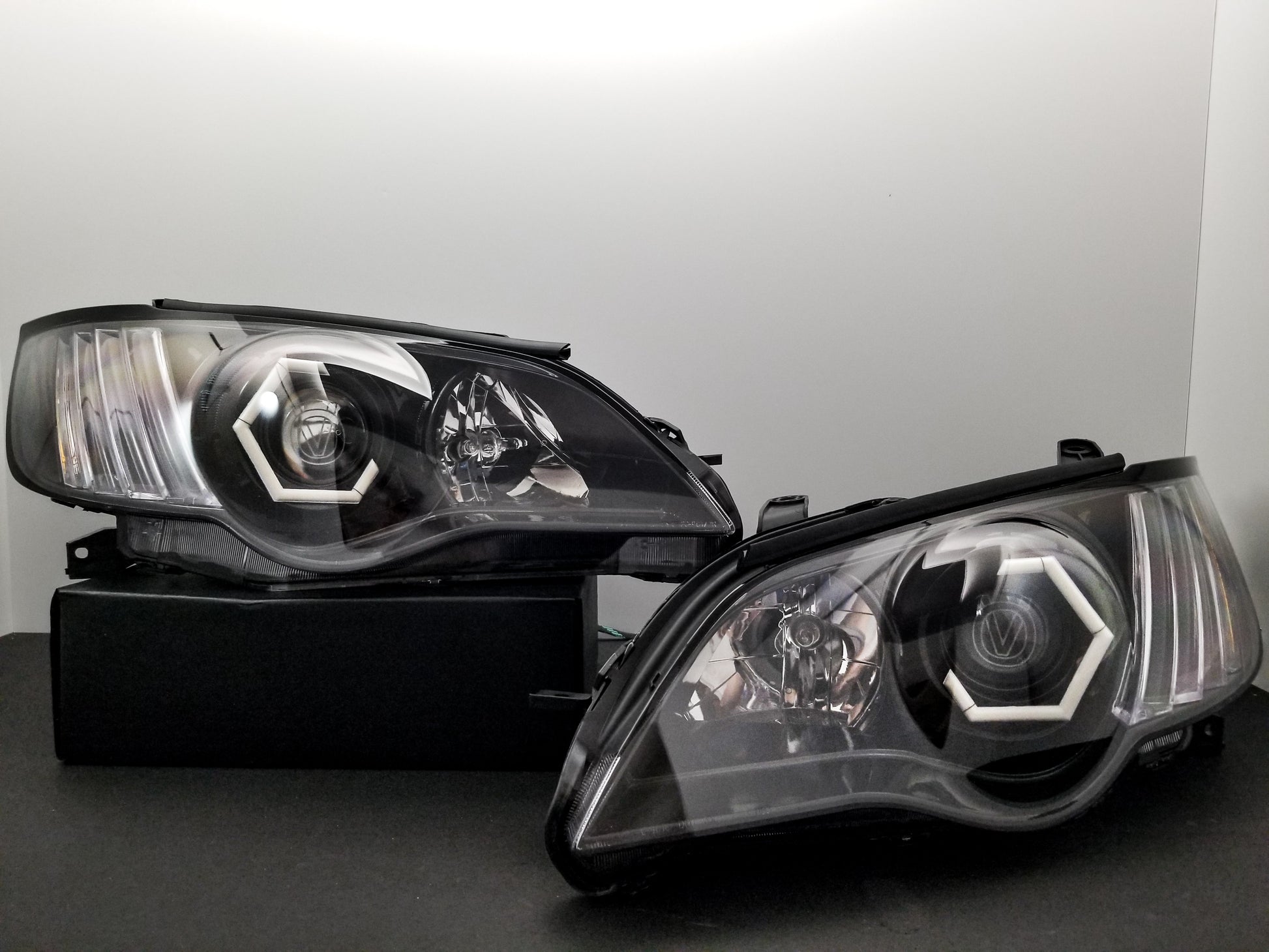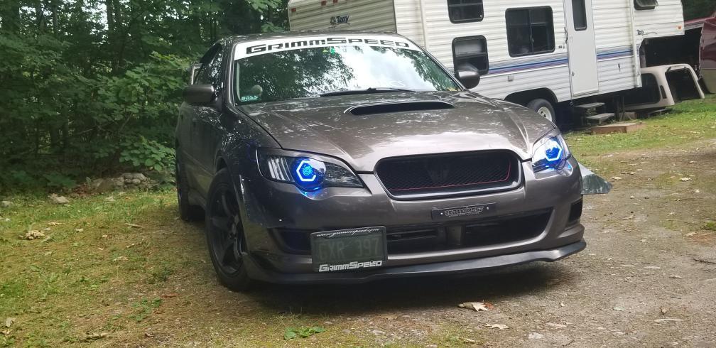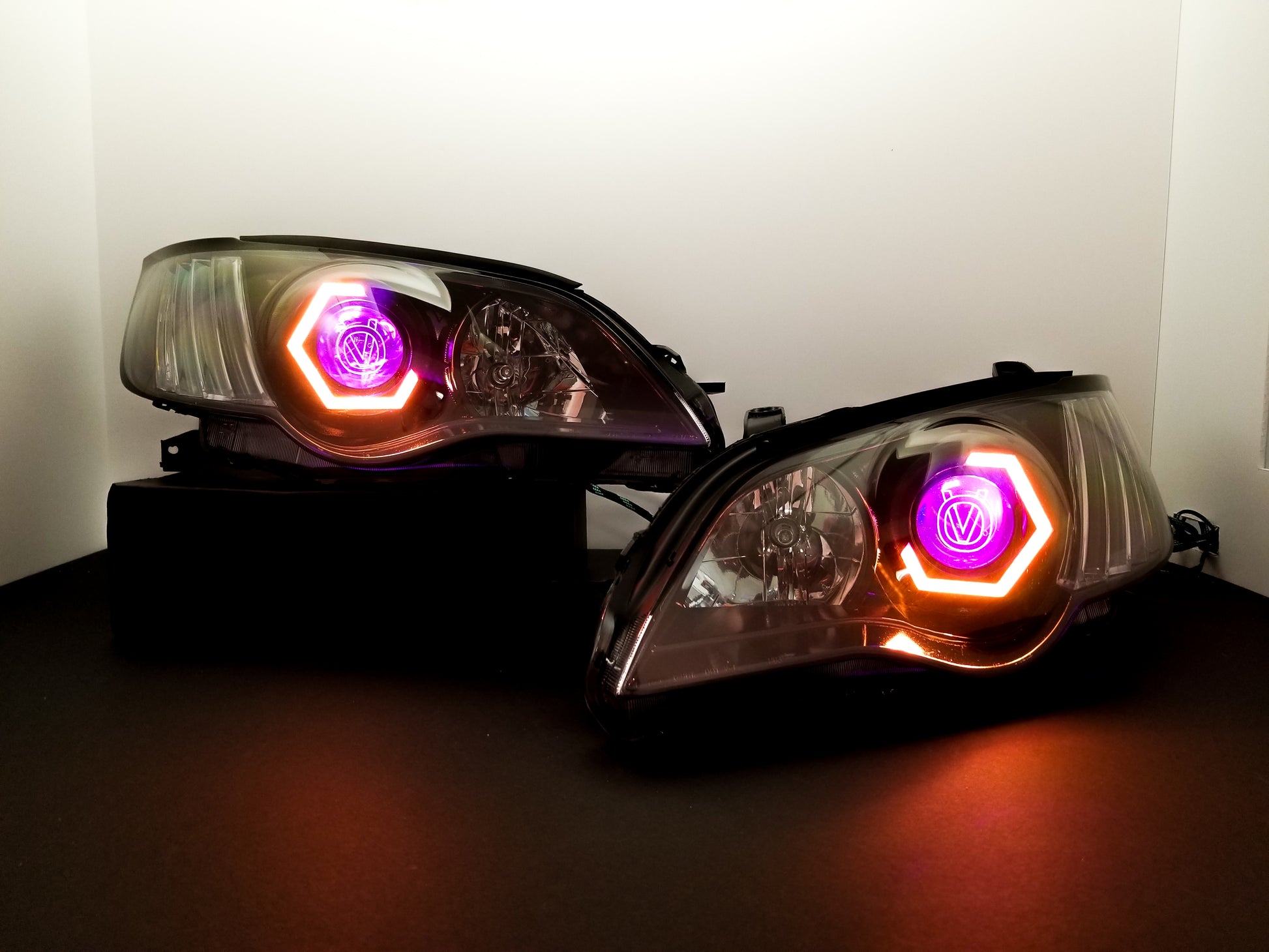 Custom retrofitted headlights for Subaru Legacy/Outback models.