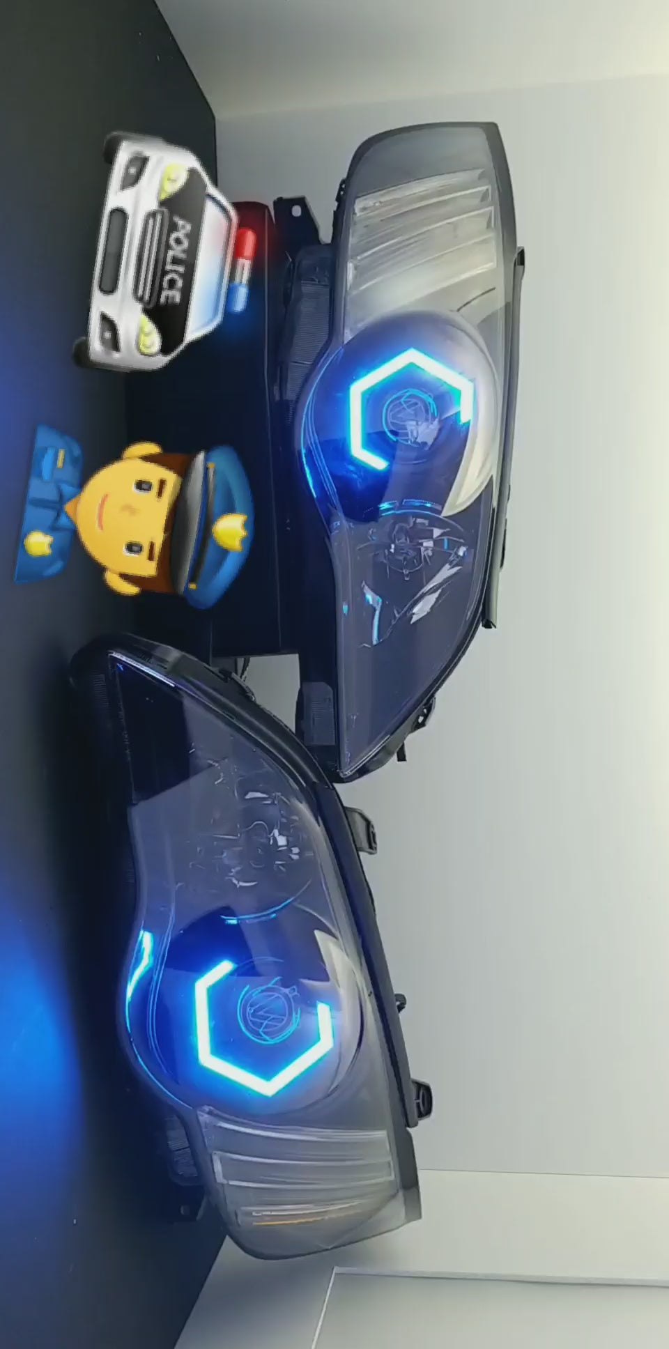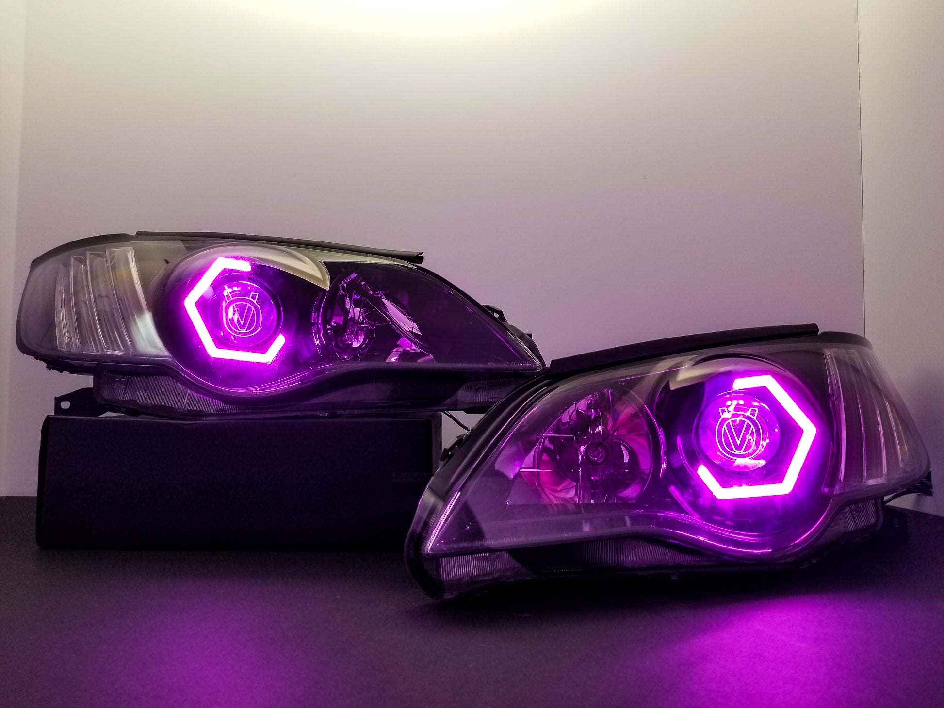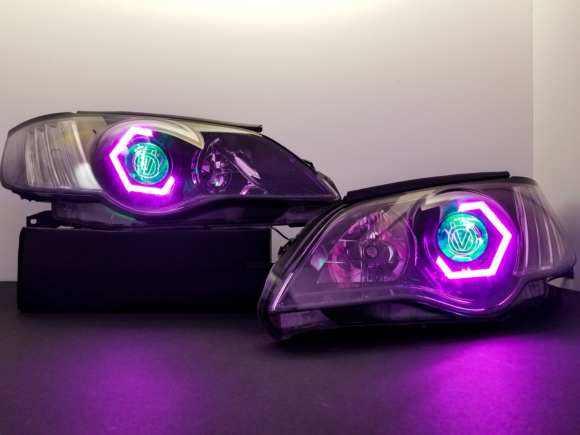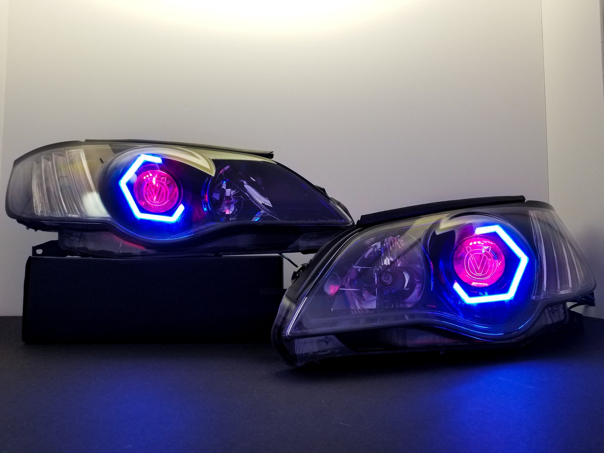 Custom retrofitted headlights for Subaru Legacy/Outback models.