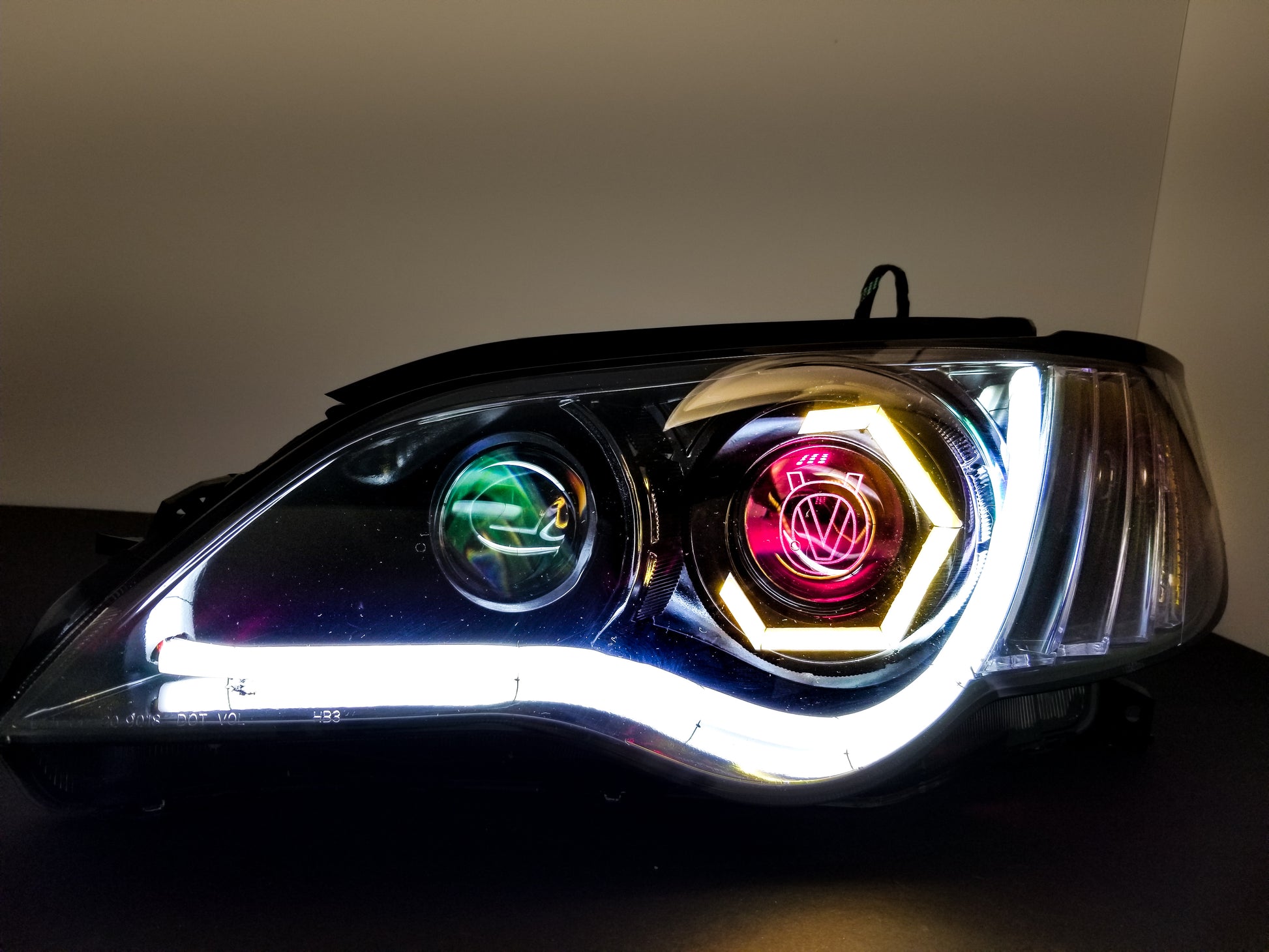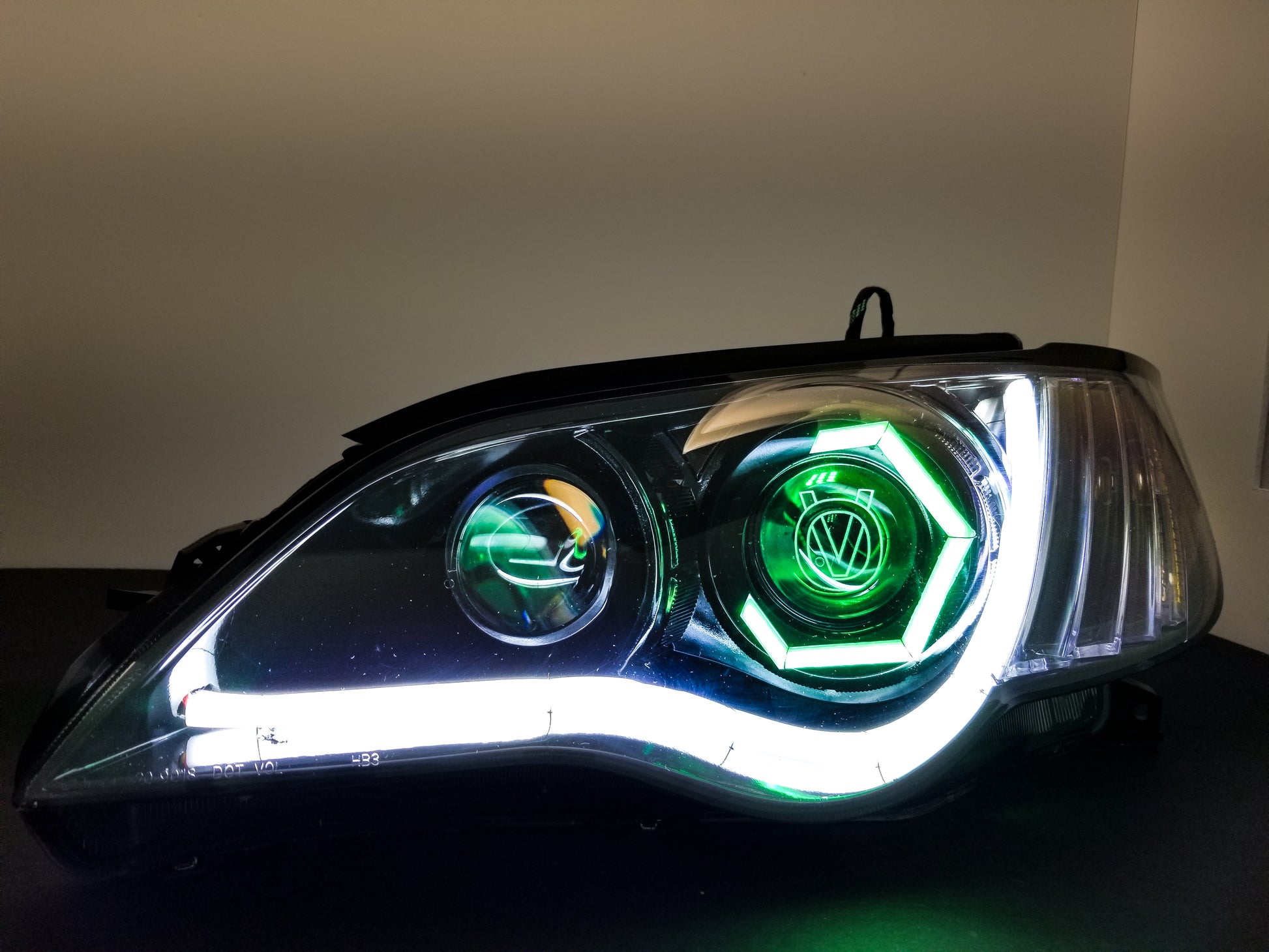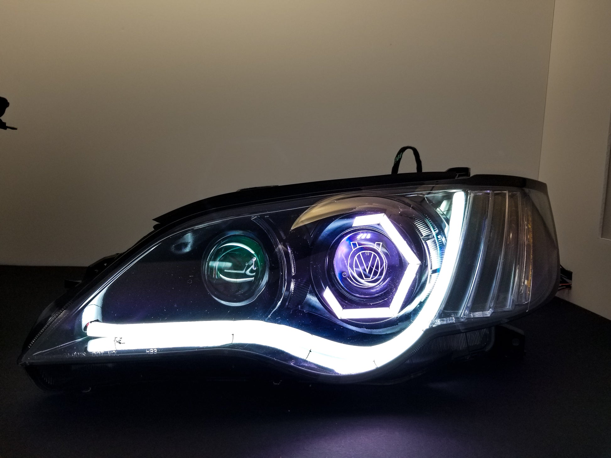 Custom retrofitted headlights for Subaru Legacy/Outback models.