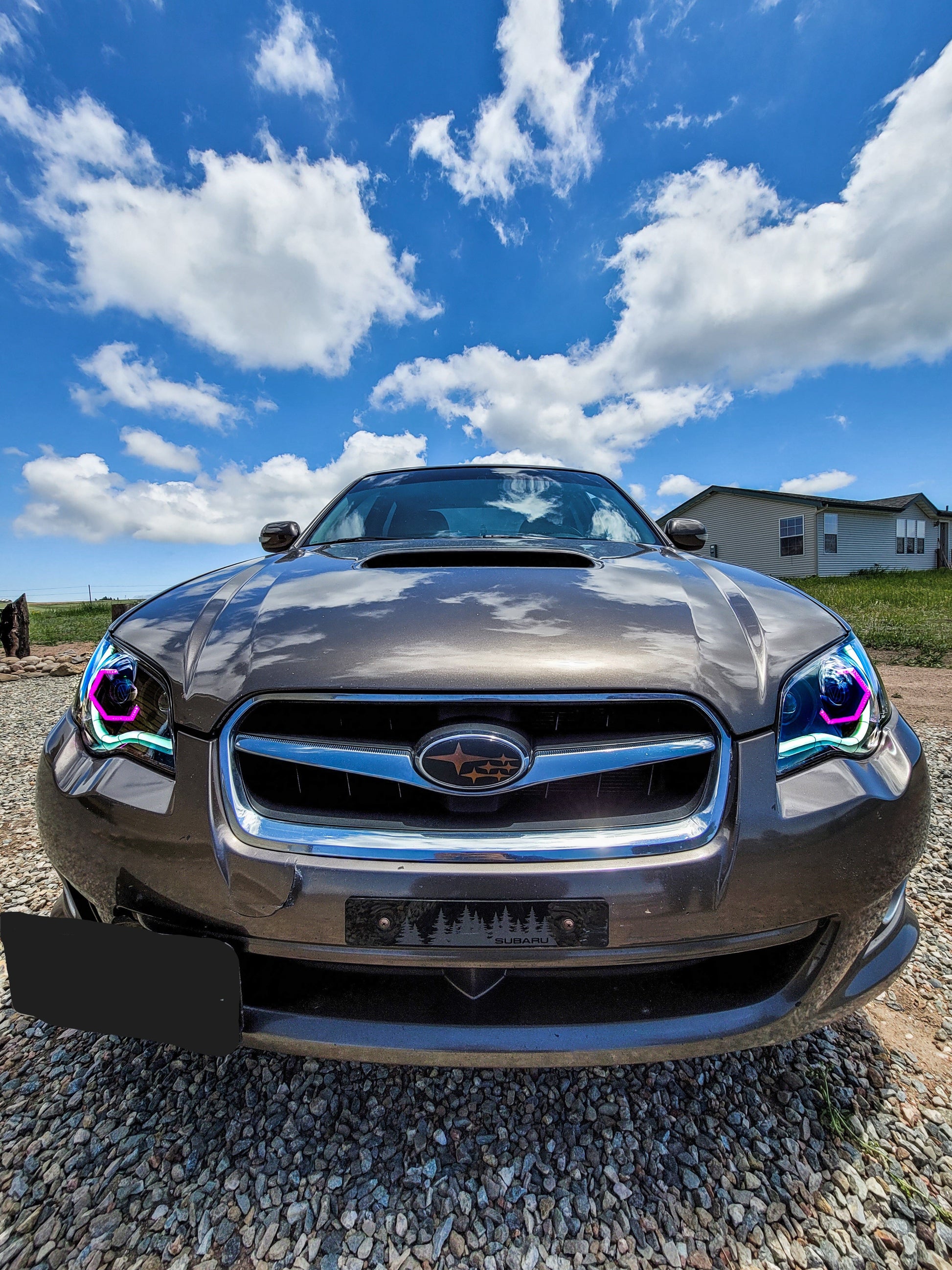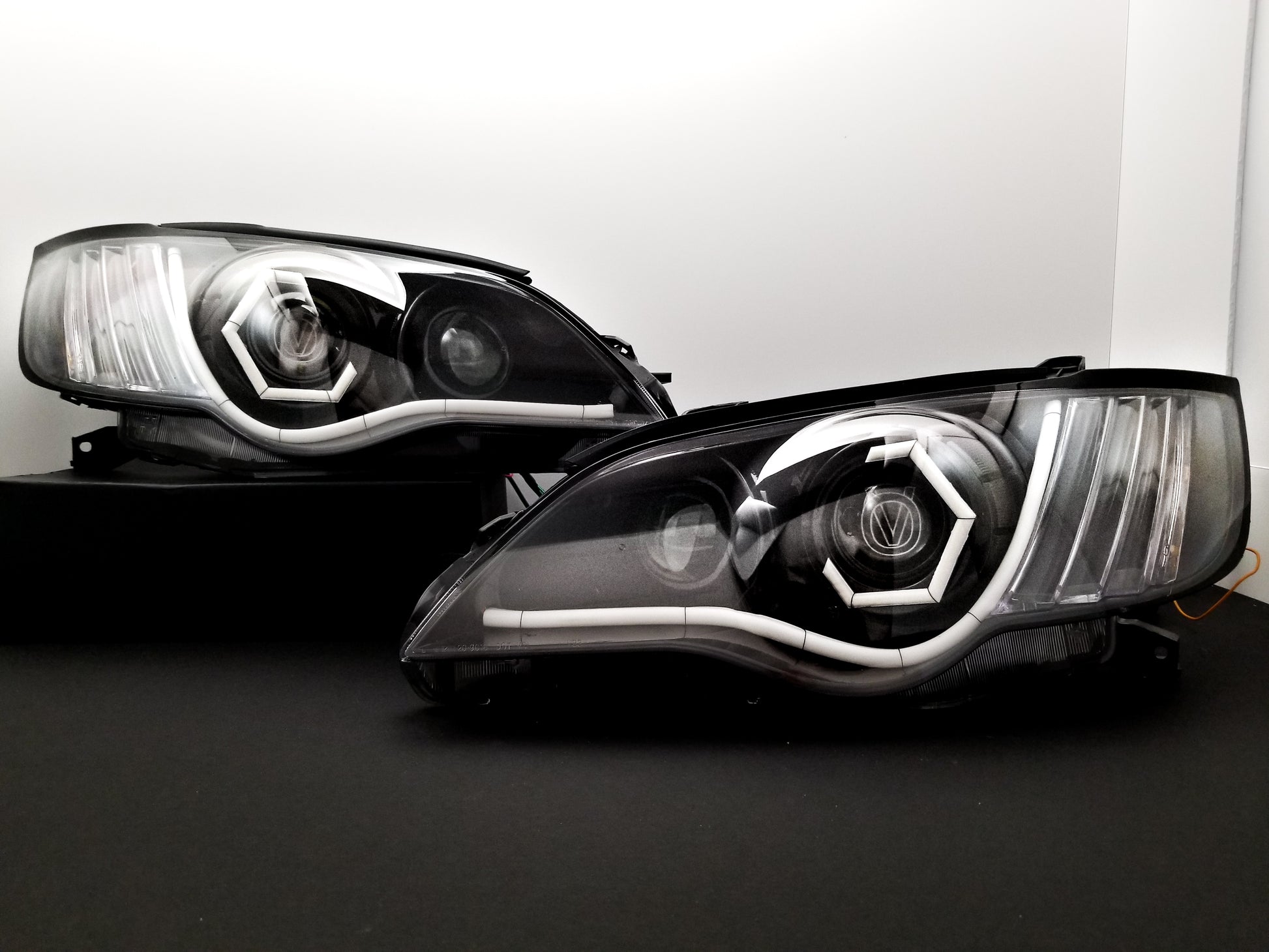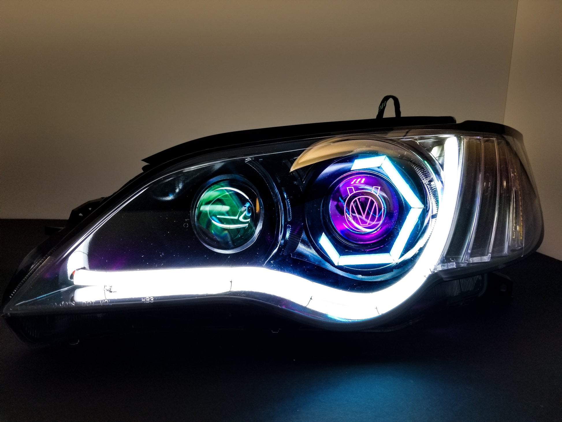 Custom retrofitted headlights for Subaru Legacy/Outback models.