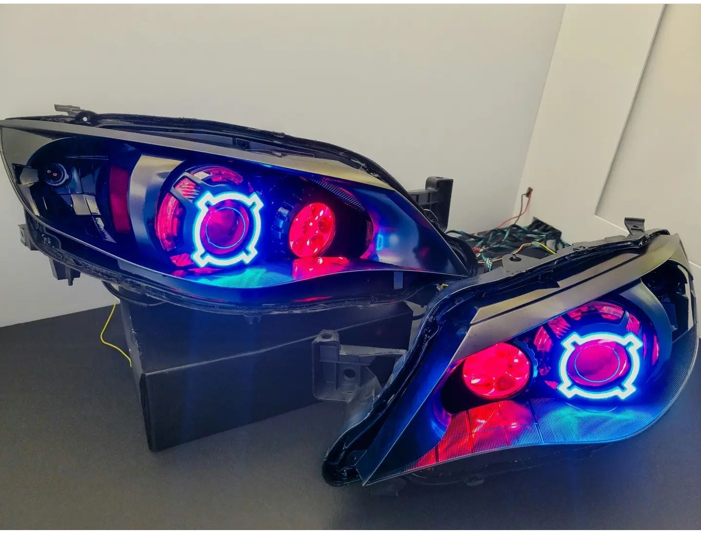 Custom retrofitted headlights for Subaru Impreza/WRX/STI models.