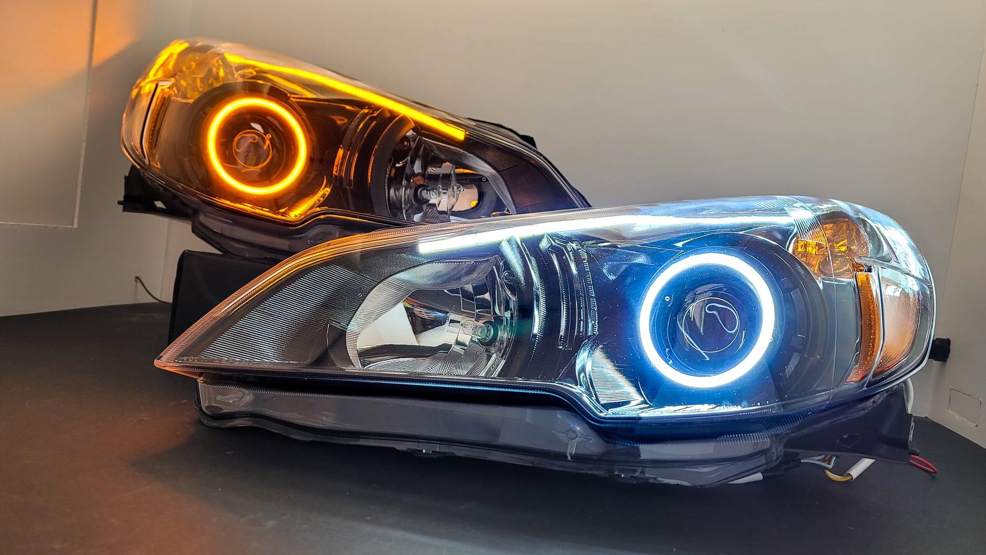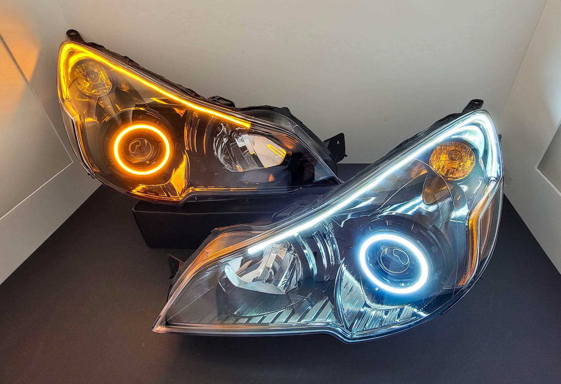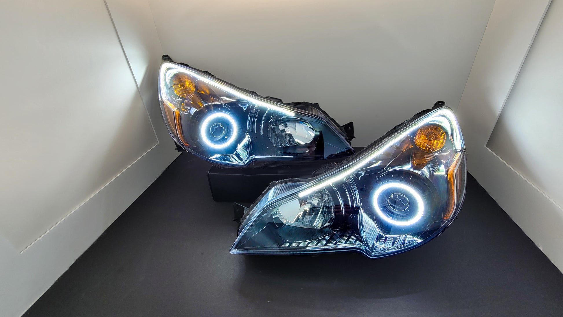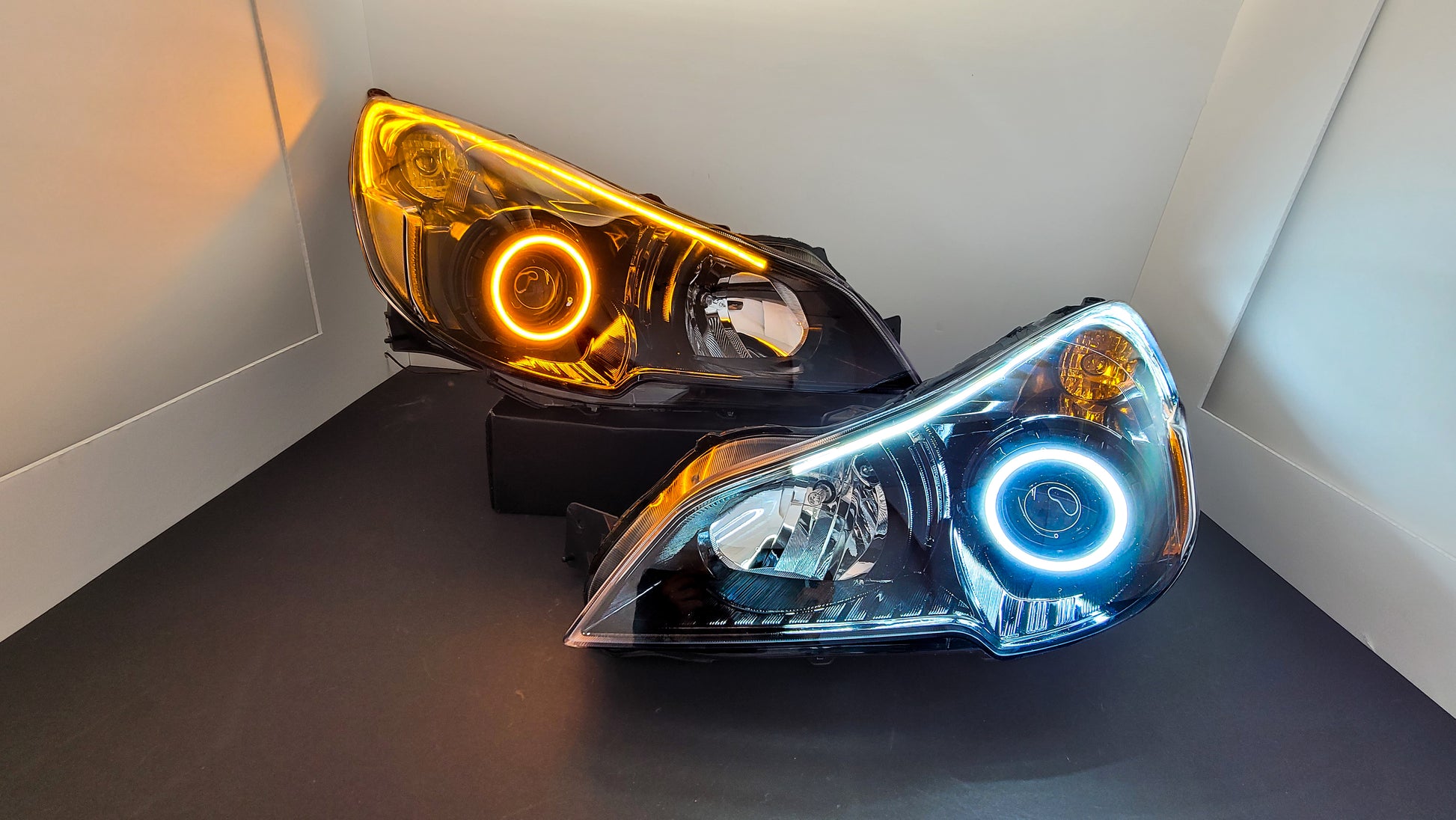 Custom retrofitted headlights for Subaru Legacy/Outback models.