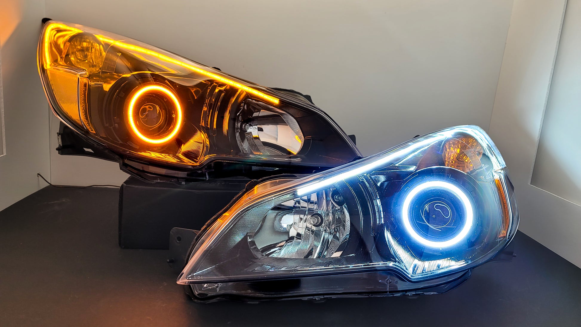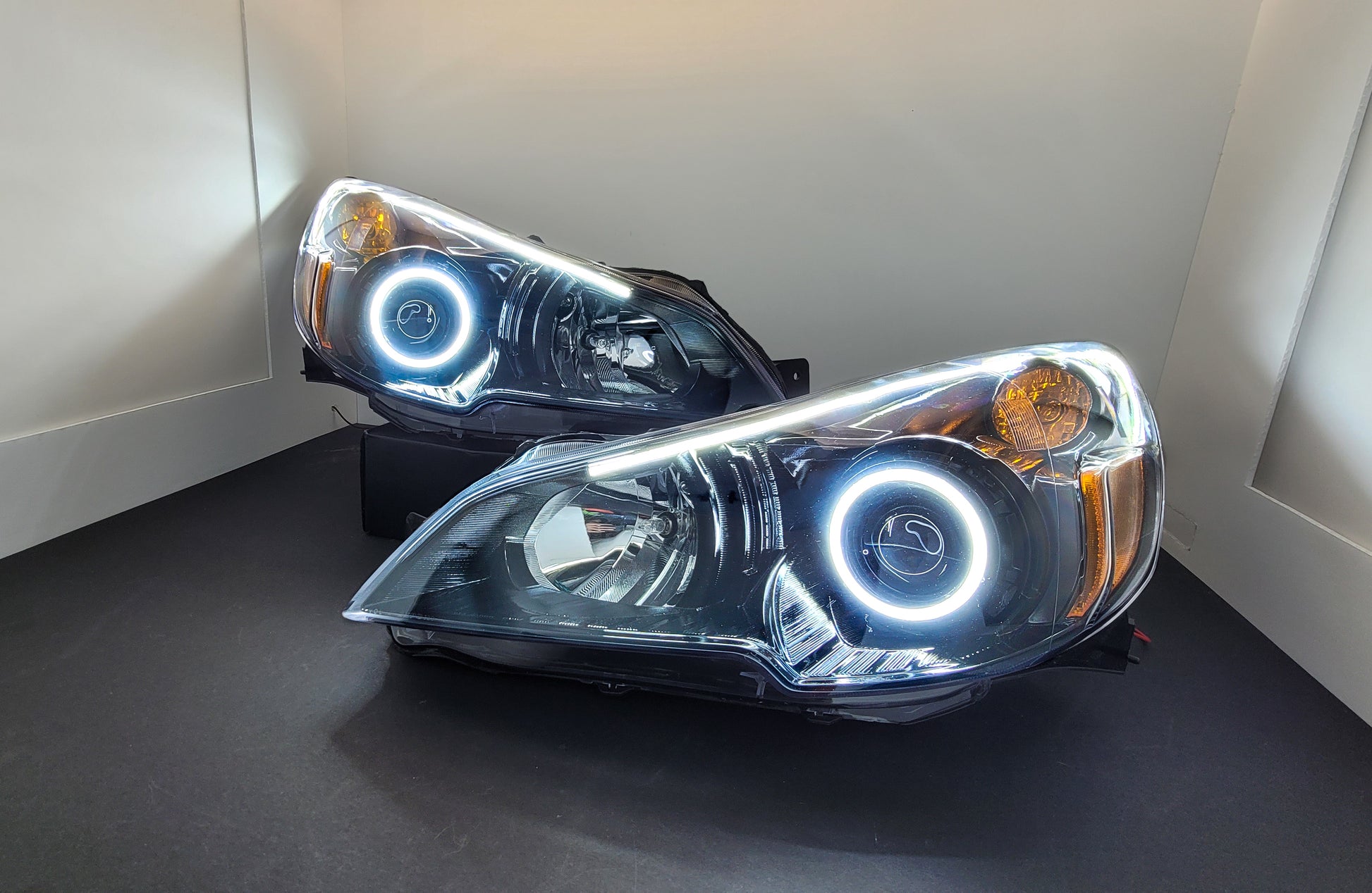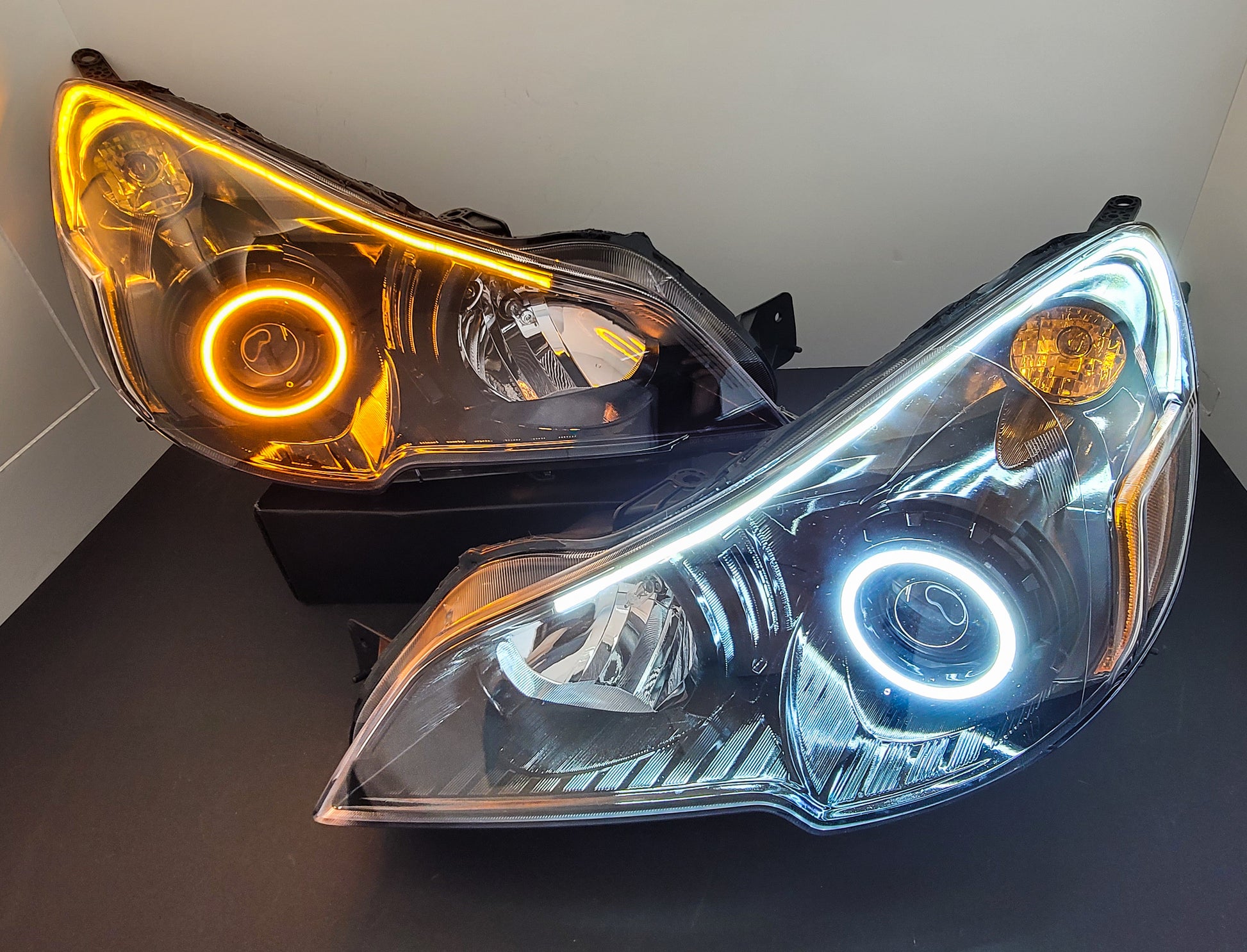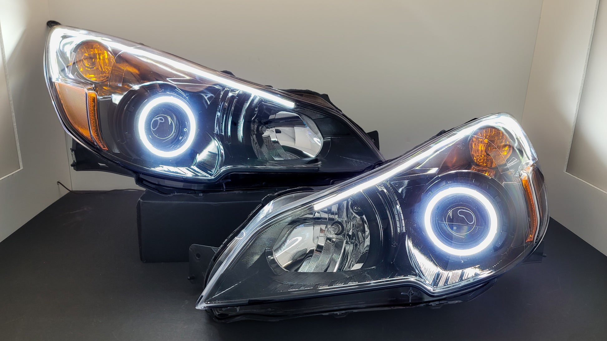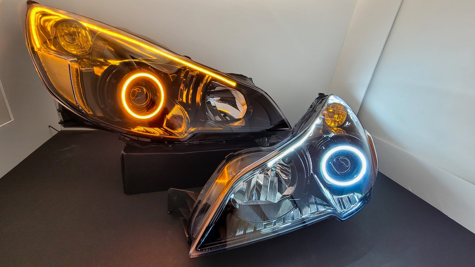 Custom retrofitted headlights for Subaru Legacy/Outback models.