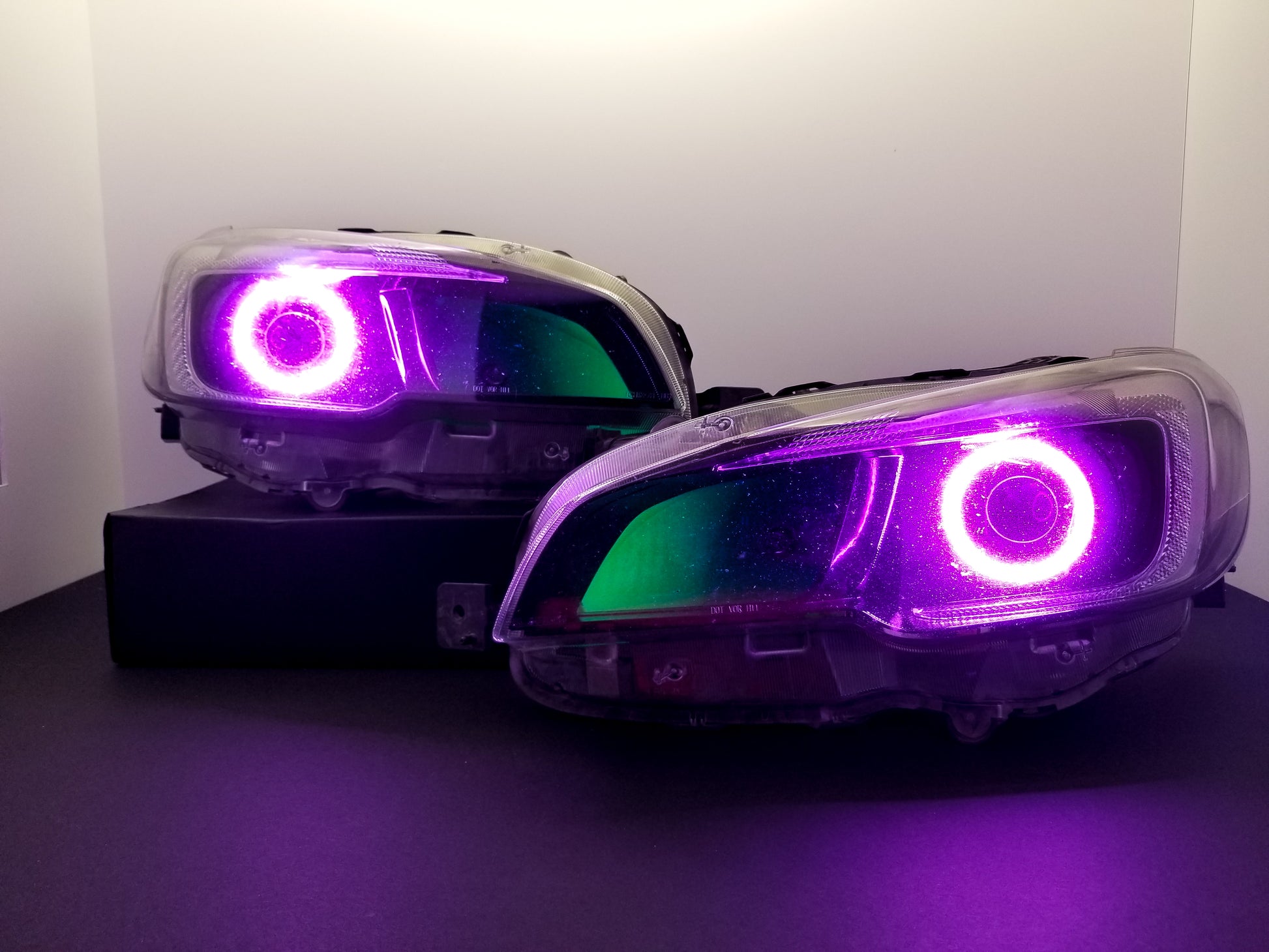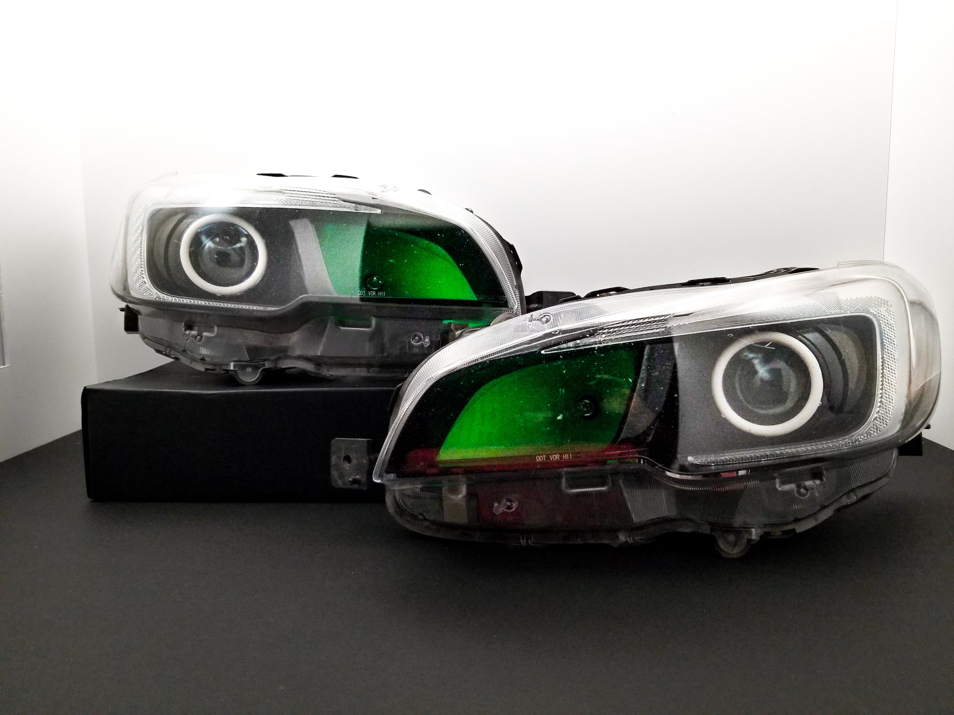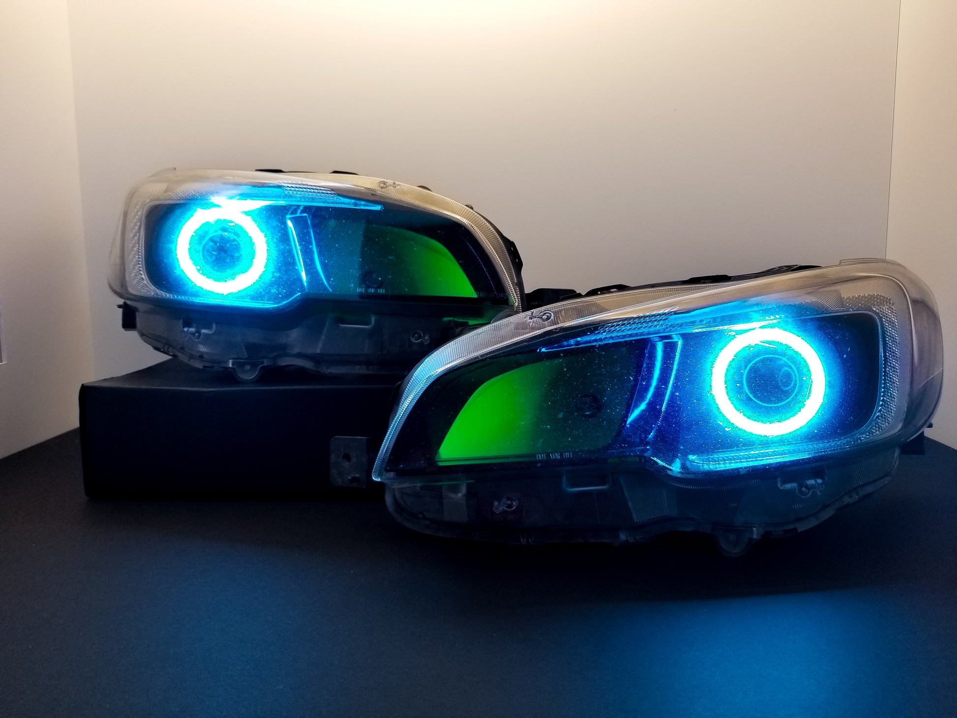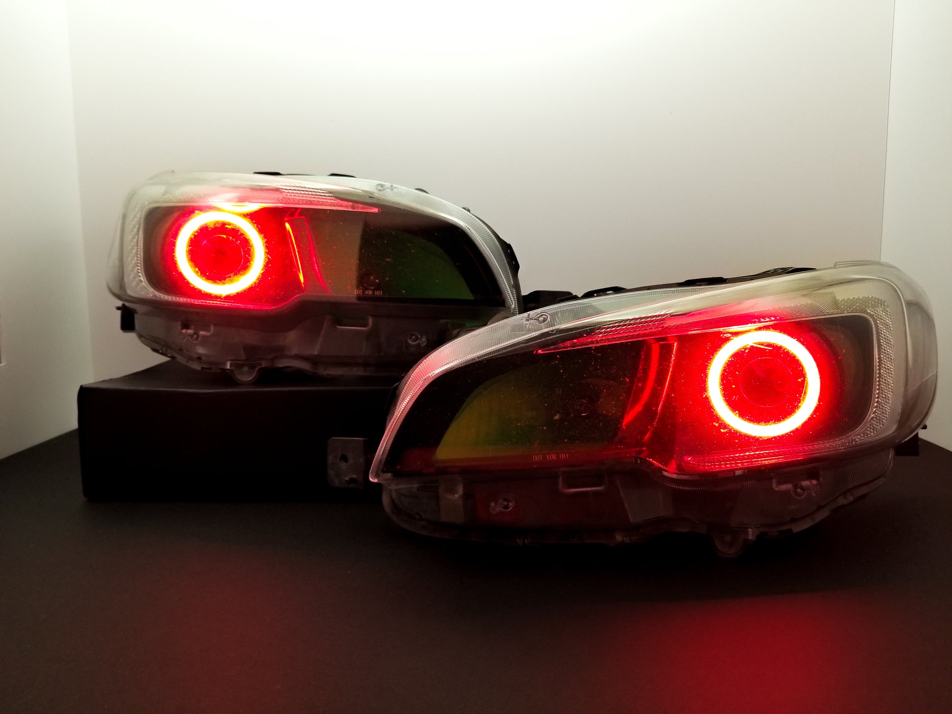 Custom retrofitted headlights for Subaru WRX/STI models.