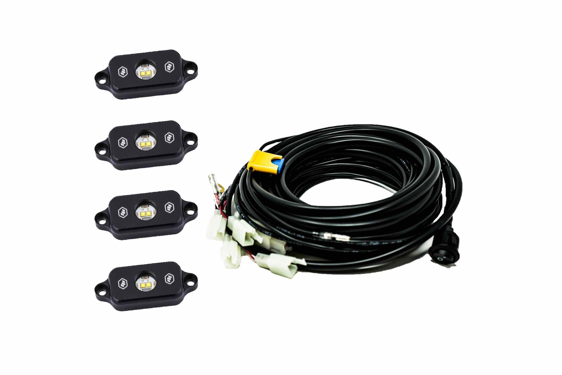 our shop: is a proud distributor for Baja Designs, their Universal Rock Light Kit takes the guess work out of buying wiring and trying to figure out how to pin relays. All of the lengths are pre-cut to reach all four corners of your small to mid-sized vehicle with some wiggle room on each lead to route the wiring any desired way. This kit includes four 400 lumen rock lights and wiring for a truly turn key kit. These LED lights: are waterproof and can be mounted virtually anywhere. All that is needed is 12 volt power. They have a 180 degree optic to illuminate your wheel wells or anywhere else you need a bright and smooth light. Caution: Rock Light can get very hot when used for long periods of time. Please use caution when handling or installing. The Question is: How many do you want? Here, you can pick up a single Baja Designs Rock Light, or a full kit which includes four lights, and a relay harness. Make it Easy: Baja's Universal Rock Light Kit takes the guess work out of buying wiring and trying to figure out how to pin relays. Baja Designs Features: uService: So you can replace the Lenses And Optics. ClearView: Gives you all The light, right where you need it most! MoistureBlock means they are Waterproof, Rain Proof, Submersible. And Baja CopperDrive: These are the only LED products on the market driven at 100%! 5000K Daylight - Less Fatigue for you as the driver & Natural Color.