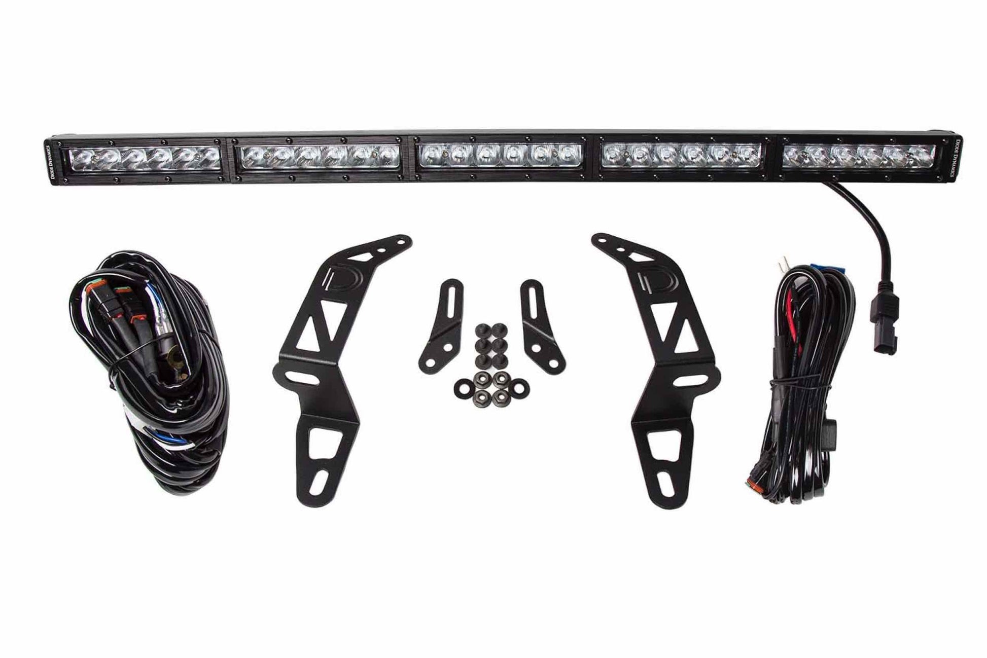 Features: Direct fitment on 2018+ Jeep Wrangler. CAD-designed for perfect fitment and OEM-like appearance. Designed to eliminate excess wind noise. Highly durable powdercoated steel construction. Utilizes existing mounting points and hardware for a simple installation. Control through factory aux switch bank using the included harness. Perfect Fitment: The Bumper LED Light Bar Kit for the 2018+ Jeep Wrangler from Diode Dynamics allows you to mount either a single SS30 Stage Series 30" LED Light Bar or dual Stage Series 30" LED Light Bars on the factory front bumper. These application-specific brackets were CAD-designed to install using factory mounting points. No cutting or drilling required! A low profile design eliminates whistling or major wind noise you may have experienced with other light bar brackets as well. Choose your look: This kit can be mounted in different ways to achieve the look you're after! Mount a single light bar using the base brackets, or use the included extension brackets to allow clearance for a winch or mount a second light bar for maximum light output. The brackets, without the light bars or harnesses, are available separately and are compatible with any generic 30" LED light bar. Control through aux switch bank: Included with the kit is our new OEM Auxiliary Switch Dual-Output Wiring Harness. This harness allows you to control your LED light bars using the factory-installed aux switch bank. For those who don't have the aux switch bank, our Heavy Duty Dual-Output Wiring Harness is also included to mount a switch and connect directly to the battery. If you would like to control the LED light bars on the dual light bar kit independently, you will need to purchase an additional Heavy Duty Light Bar Wiring Harness. Designed For Performance: Using optical simulation modeling, Diode Dynamics Stage Series LED light bars have been designed for maximum functionality, with compact size, custom-engineered TIR optics, and a useful beam pattern, all in a highly durable package. Our light bars shine light in a highly-functional and useful beam pattern, much more focused than older LEDs on the market. Click here to learn more: Total Internal Reflection (TIR) Optics | Stage Series Video. Functional Patterns: All Stage Series beam pattern options were designed with optical simulation modeling, to shape the output in a highly-functional beam pattern. No matter what your auxiliary lighting needs are, there is a Stage Series optic for you! The Driving pattern was designed to supplement your high beams. Rather than a simple "spot" pattern, the Stage Series Driving pattern has a rectangular 20Wx8H degree pattern that is far more useful for directing light downrange at high speeds. The Flood pattern was designed to provide uniform, even illumination and a full 80Wx50H degree spread of light. Unlike generic "flood" light optics that are simply a heavily diffused spot, our flood optic is a true optically designed spread, resulting in the biggest spread in the industry! It is perfect for lighting up anything at low speeds, a backup or reverse light, or to light up a worksite. The Combo pattern combines both the Driving and Flood optics. It shines light downrange in a focused, rectangular 20Wx8H degree pattern while also illuminating area around it in a full 80Wx50H degree spread. The Stage Series 30" Combo Light Bar features three driving lenses in the middle with two flood lenses on the outer edges.