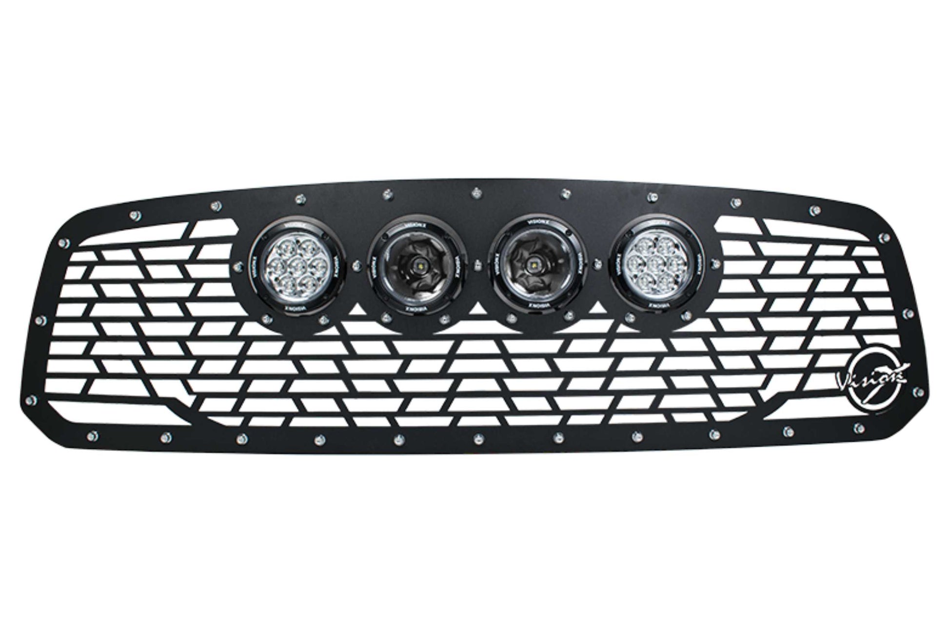 Grille Info: This custom line of Vision X grilles was made for us from our friends over at Royalty Core. These grilles have a satin black power coat over a rugged stainless steel frame. Optional CG2 4.7inLight Cannons: The CG2 Light Cannons is Vision X's latest and greatest of the Light Cannon series. This configuration combines the distance of the big chip single source CG2 Cannon with the massive light output of the multi-LED version. The pairing of these two lights creates an unheard of amount of brightness and distance ideal for any situation. Optional XPR-9M Light Bar: Utilizing top-binned 10-Watt LEDs and large proprietary 1.5indiameter IRIS Reflectors, the XPR-9M Light Bar is capable of reaching a staggering 1,365 feet of usable light. This unmatched long-distance projection is also accompanied by precisely tilted IRIS Reflectors that create a unique combination beam pattern to provide even more visibility at the road's edge.